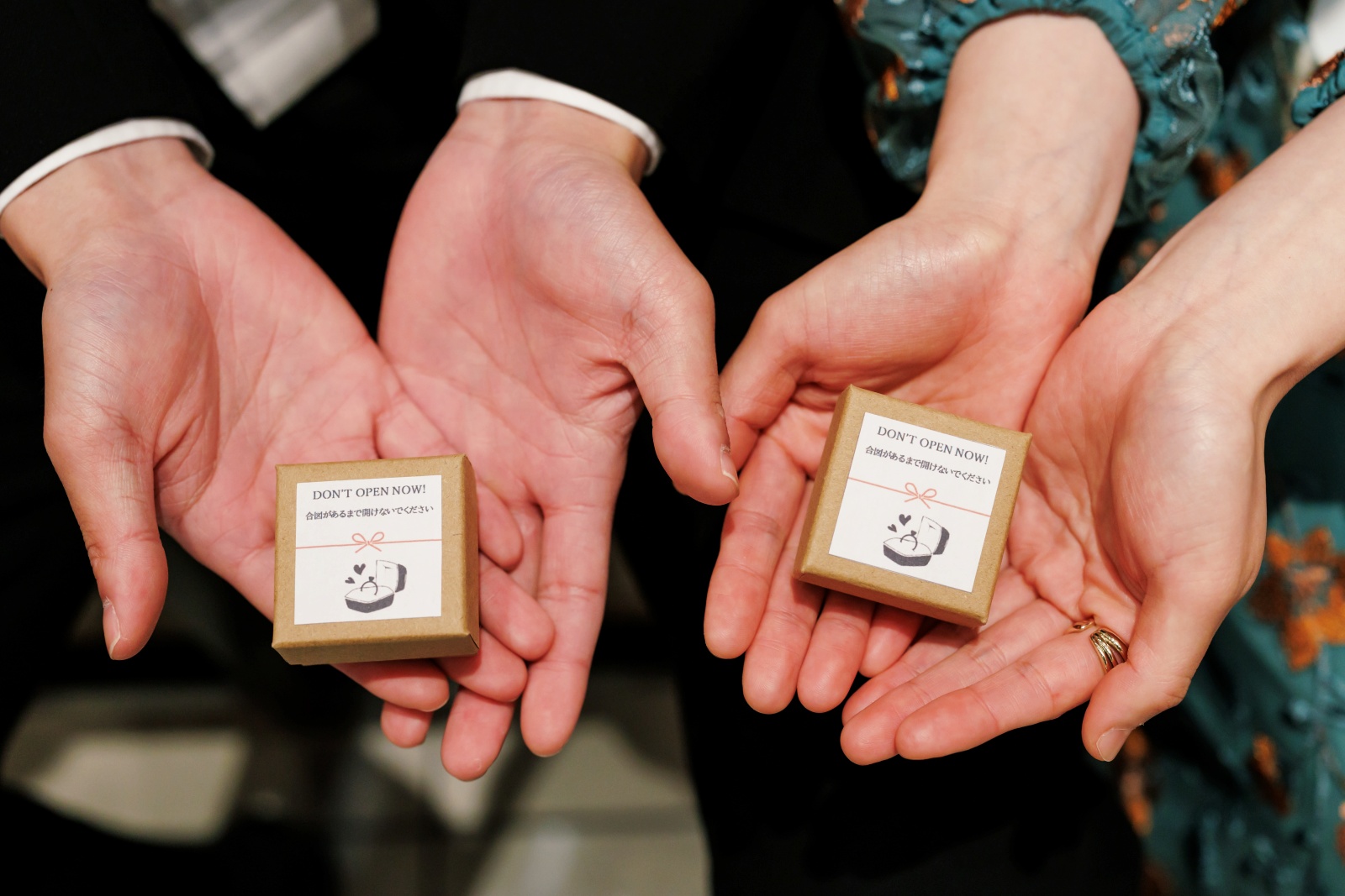 新郎様側、新婦様側のゲスト1名ずつのBOXの中に、おふたりの結婚指輪が