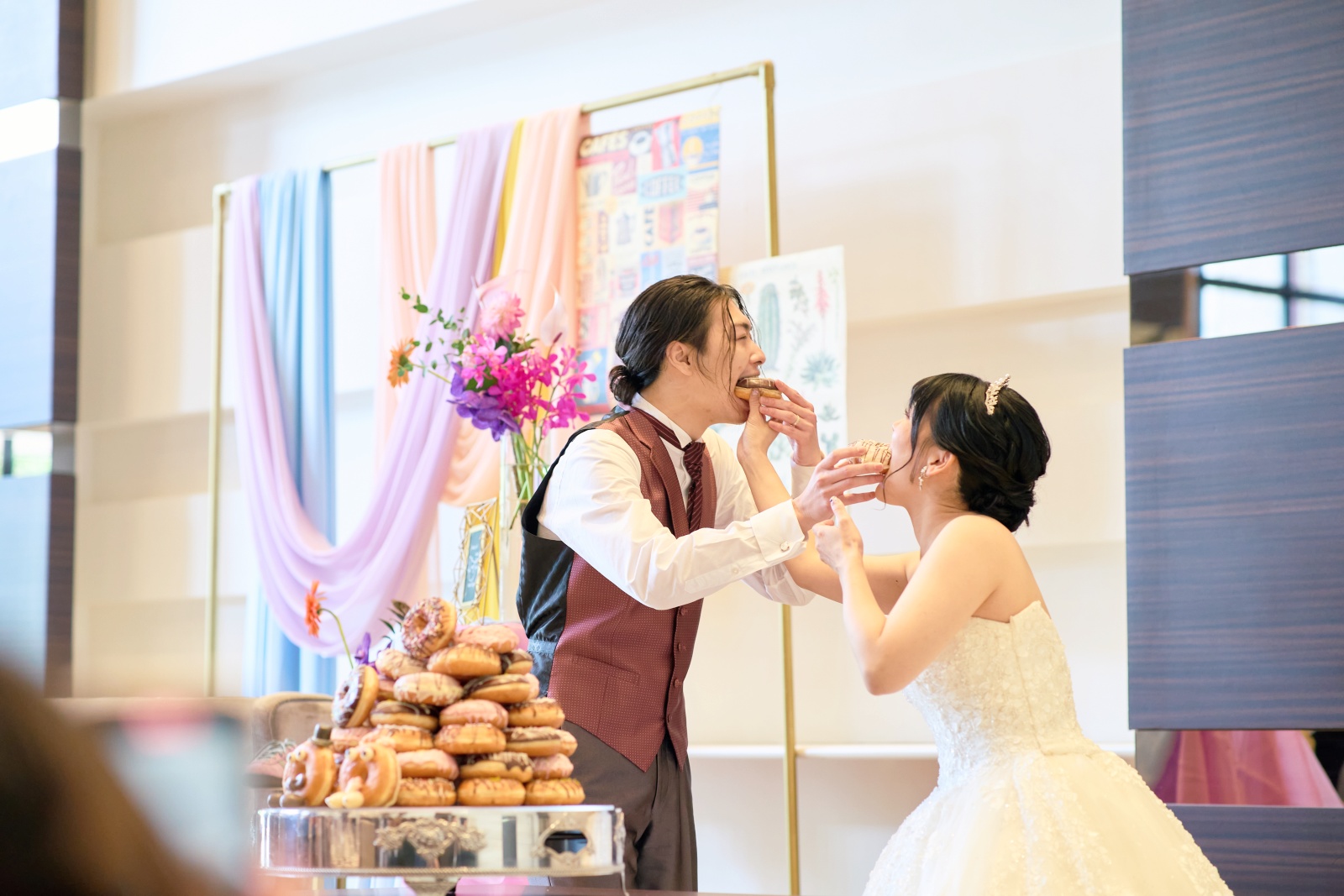 そしてケーキ入刀の代わりに、新郎新婦ドーナツを。