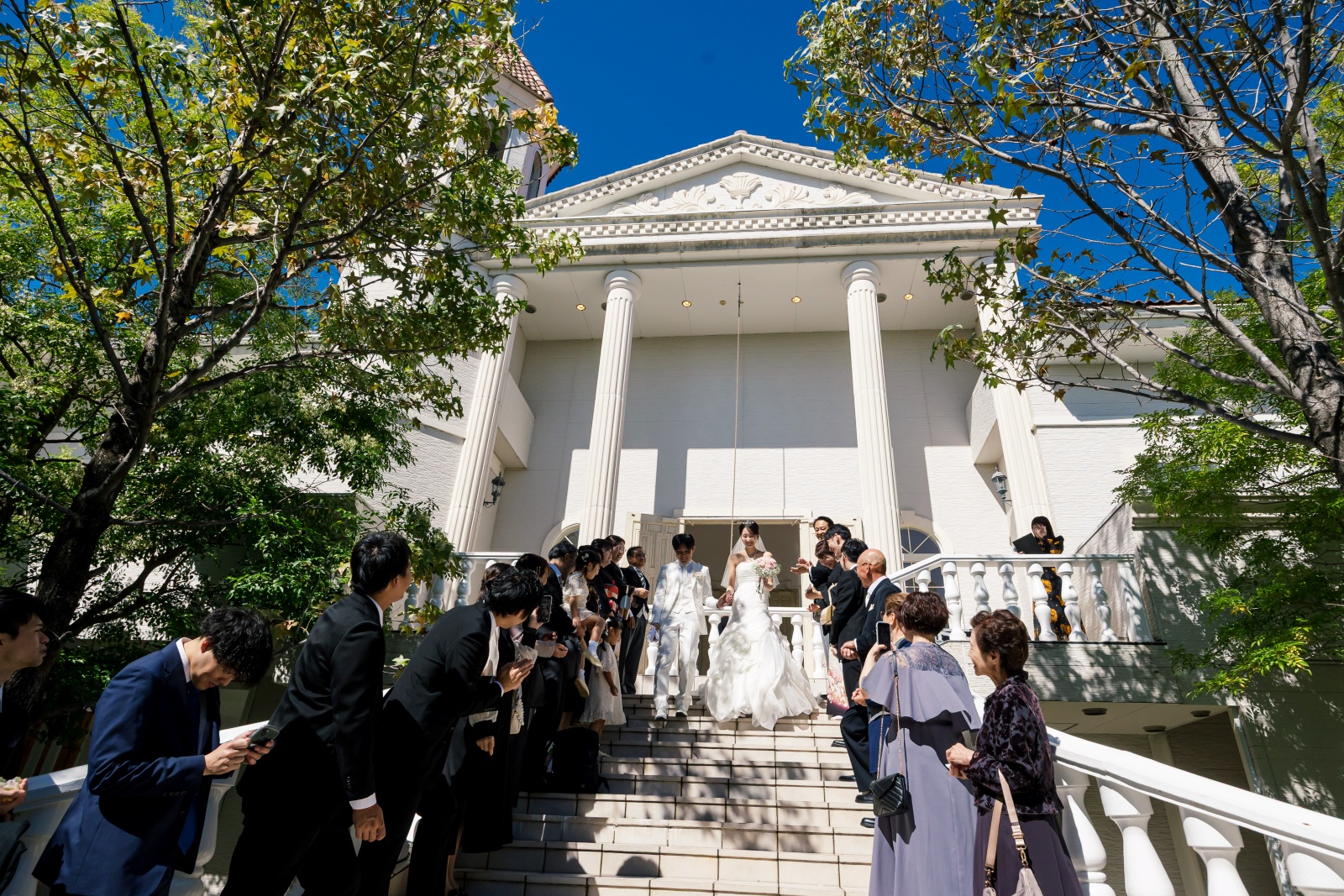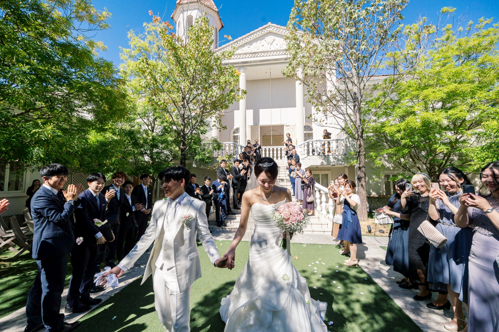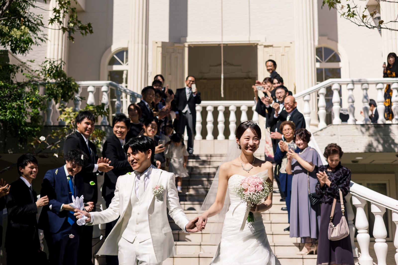「おめでとう」の声と、祝福のフラワーシャワーを浴びながら