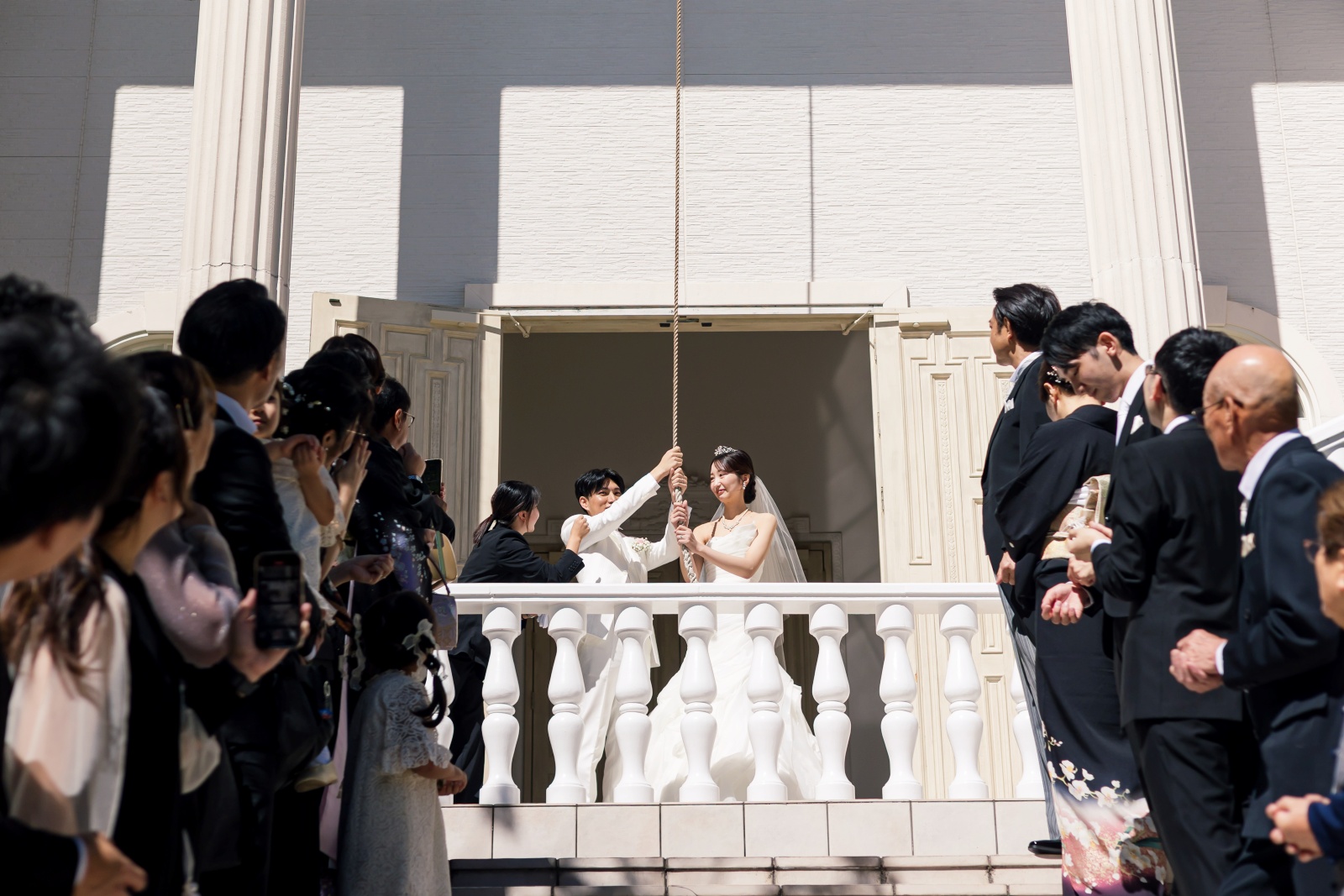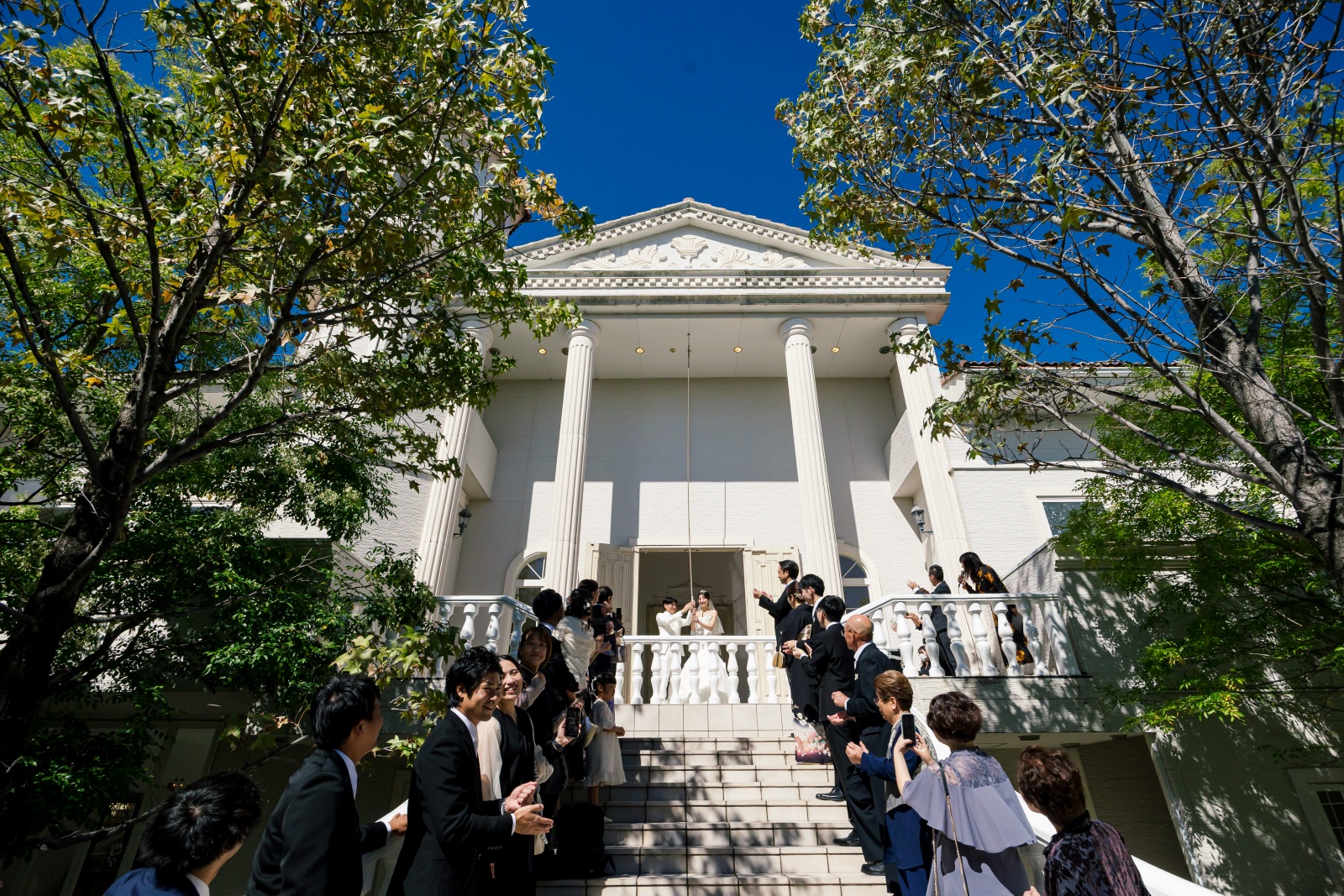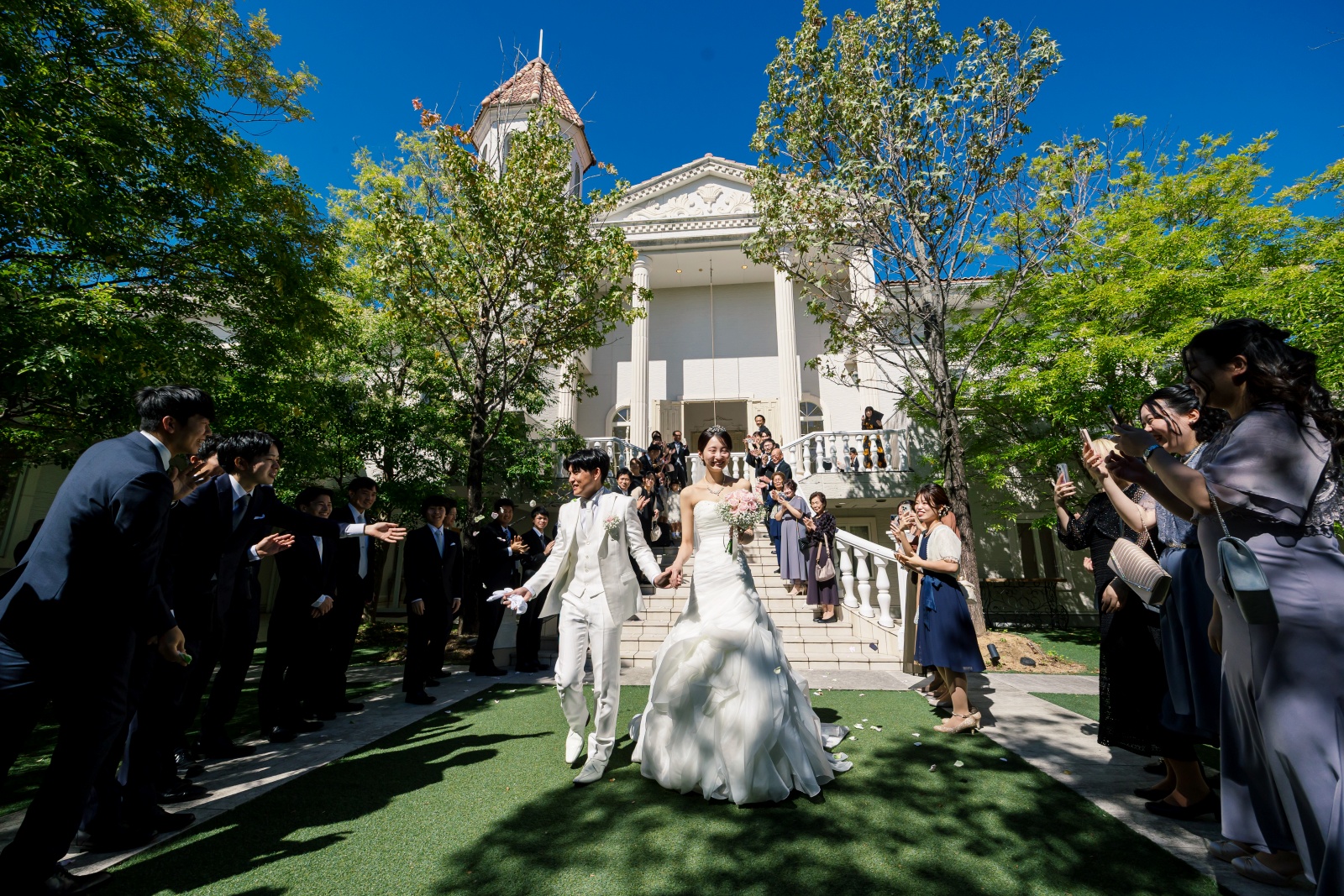 「おめでとう」の声と、祝福のフラワーシャワーを浴びながら