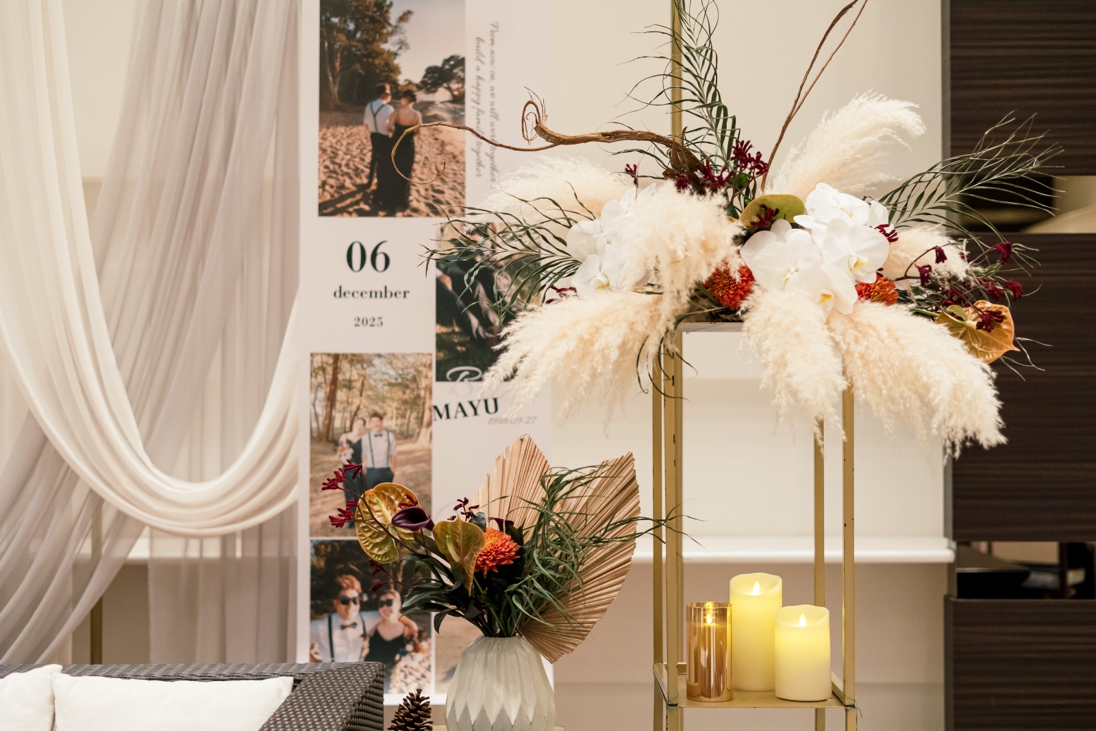 ゴールドフレームには2色のオーガンジーでドレープを。