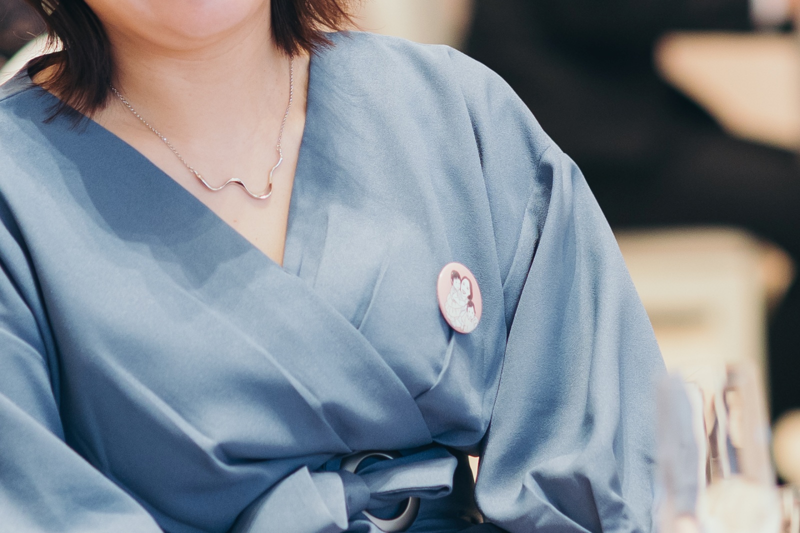 缶バッチを手に取るゲストの笑顔。