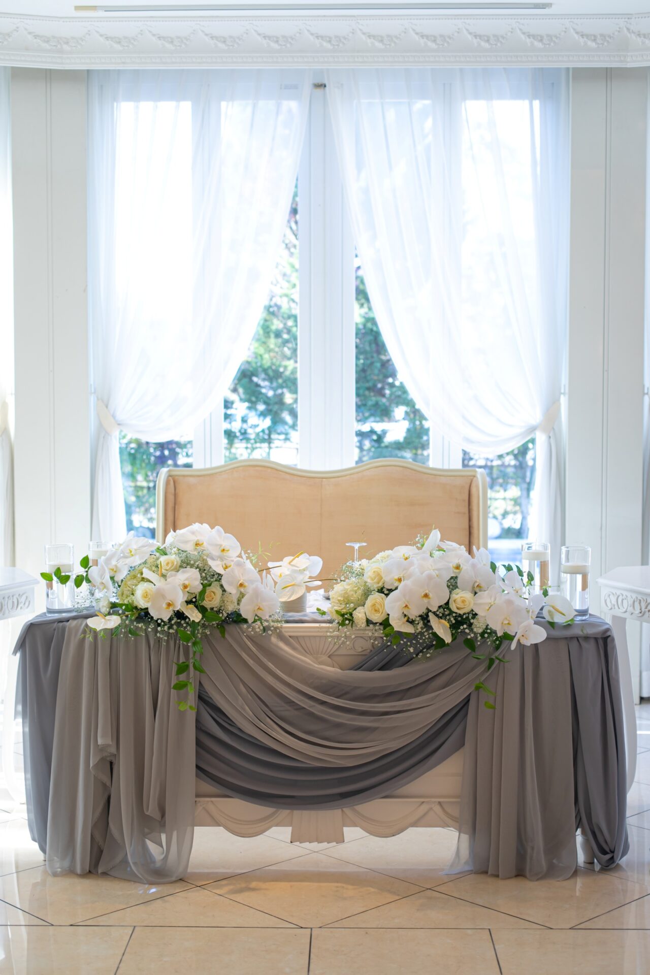 純白のテーブルに濃淡2種類のグレーのオーガン。 胡蝶蘭をメインに白×グリーンの装花で 甘すぎない上質な温もりを。