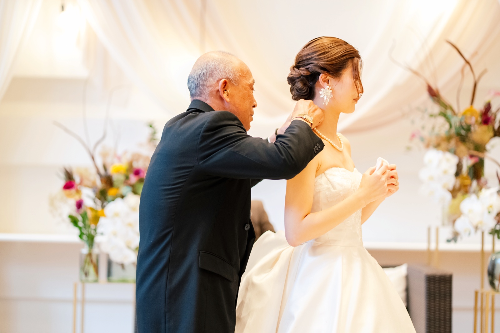 おじいさまに形見のネックレスを付けて頂くシーンをご提案。