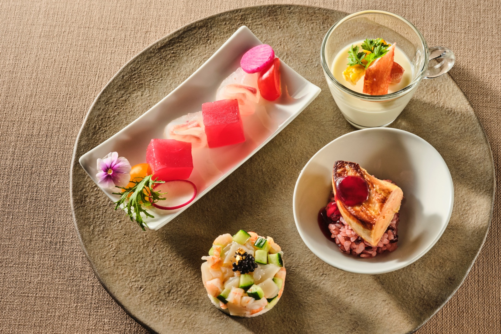 鯛と鮪のカルパッチョやフォアグラのポワレ、カリフラワームースやタルタルのガーリックトースト。