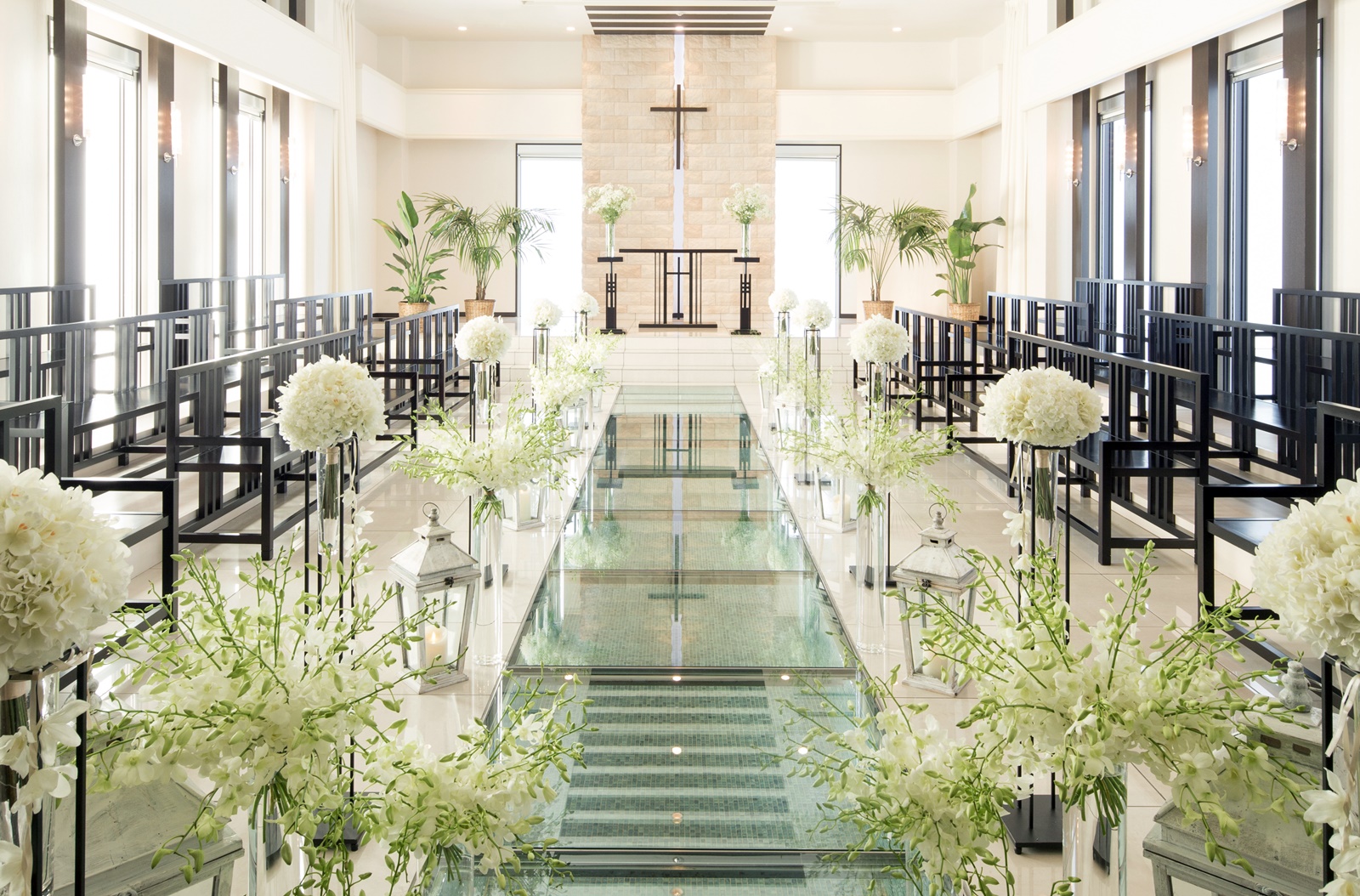 チャペルウェディングは、幻想的な光や音楽の演出で感動的なセレモニーを実現できるのが魅力です。白を基調とした空間に差し込む光や、ステンドグラスの輝きは、花嫁姿をいっそう引き立てます。