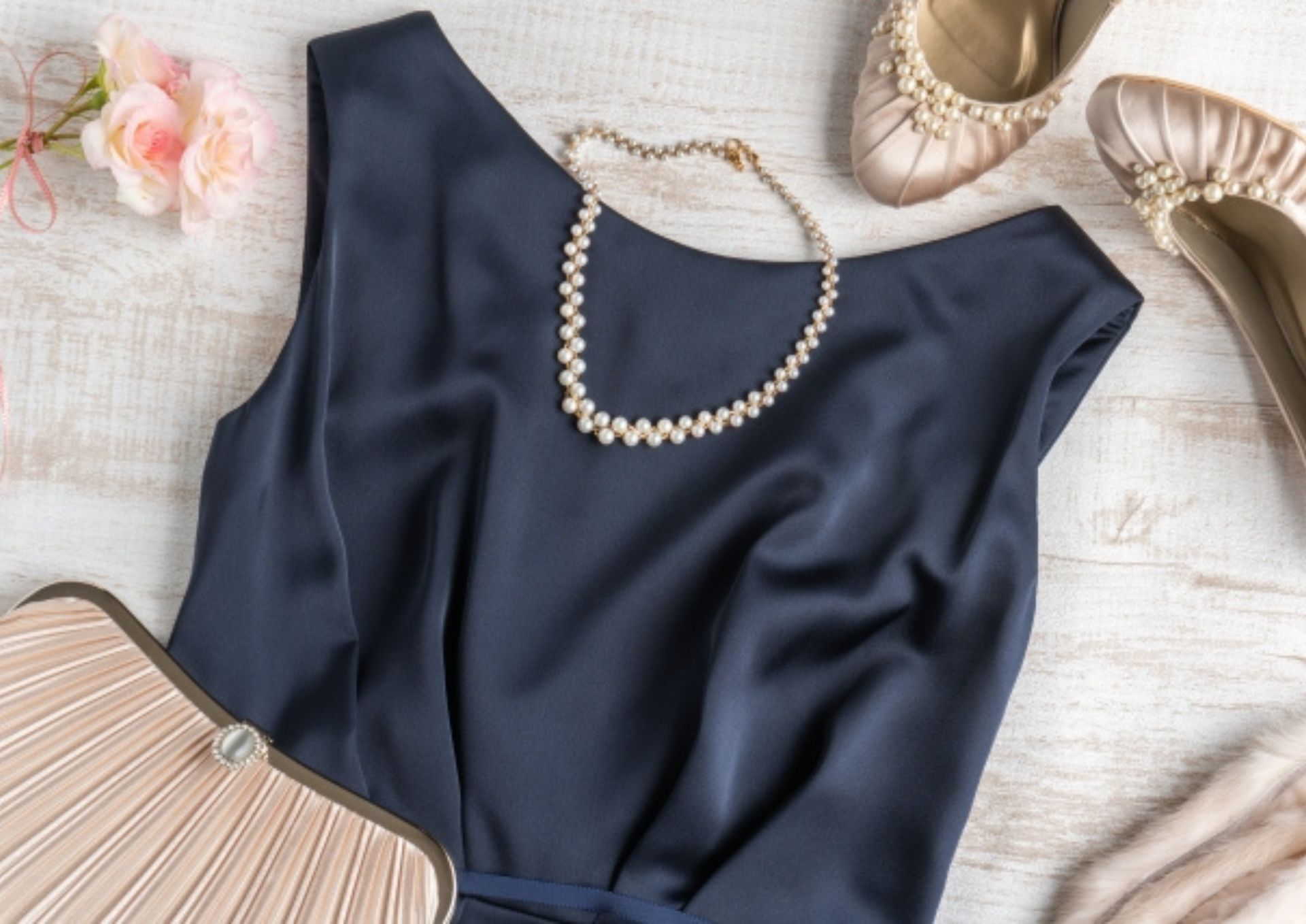 肩や背中が大きく開いたデザインは控えめに。羽織物で上品にまとめるのがベターです。 - 光りすぎる素材は控える