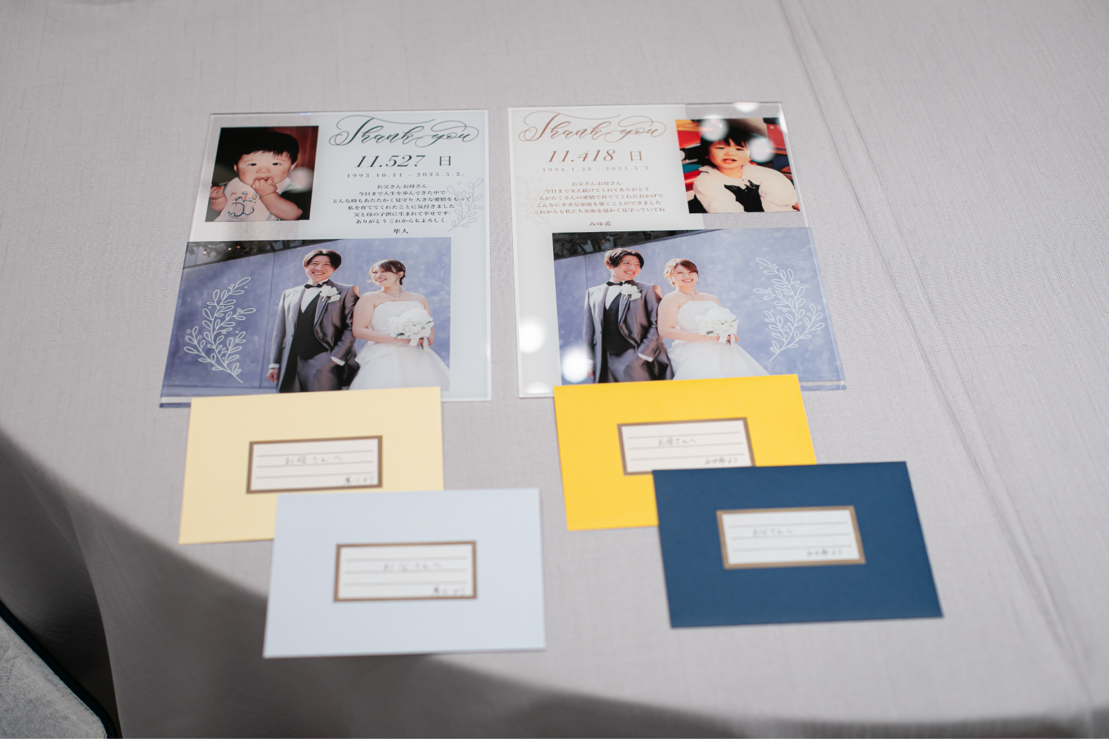 親御様への感謝を伝えるお時間。お手紙のプレゼントです。結婚生活10年を過ごされてきたおふたりだからこそお持ちになる感謝の思いをお伝えになりました。そして子育て感謝状をプレゼント。おふたりのお写真と、誕生から今日までの日々を数え記した、とても素敵な贈り物です。