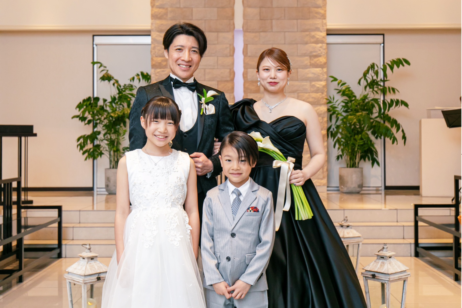 家族で挙式リハーサル。パパとママの素敵な姿を笑顔で見守る2人のお子様の笑顔がさらにチャペル内に幸福感を満たします。