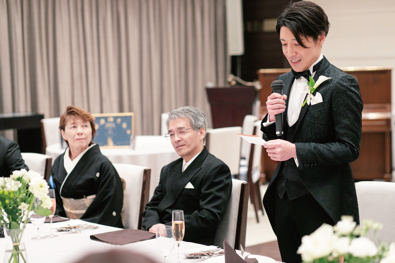 乾杯のご発声はお兄様から。お兄様からも伝えたい思いが。そんなお兄様の目を笑顔で見ながらスピーチを聞かれる新郎新婦様。
