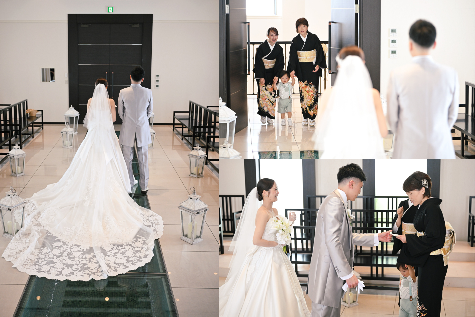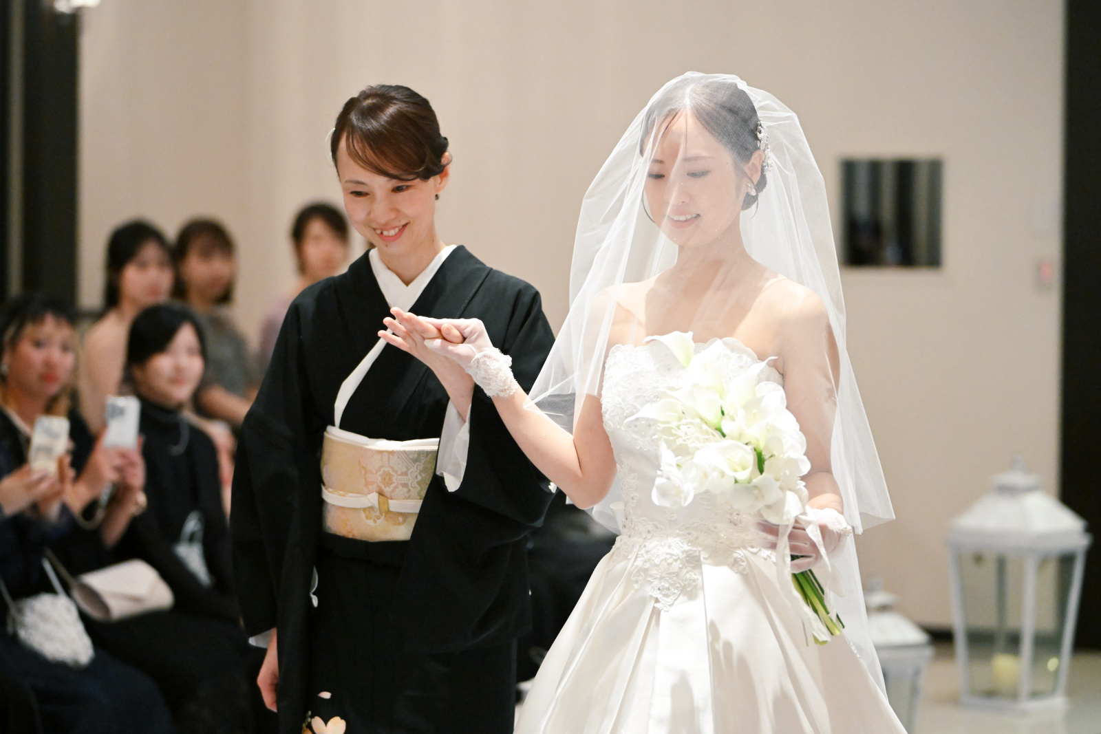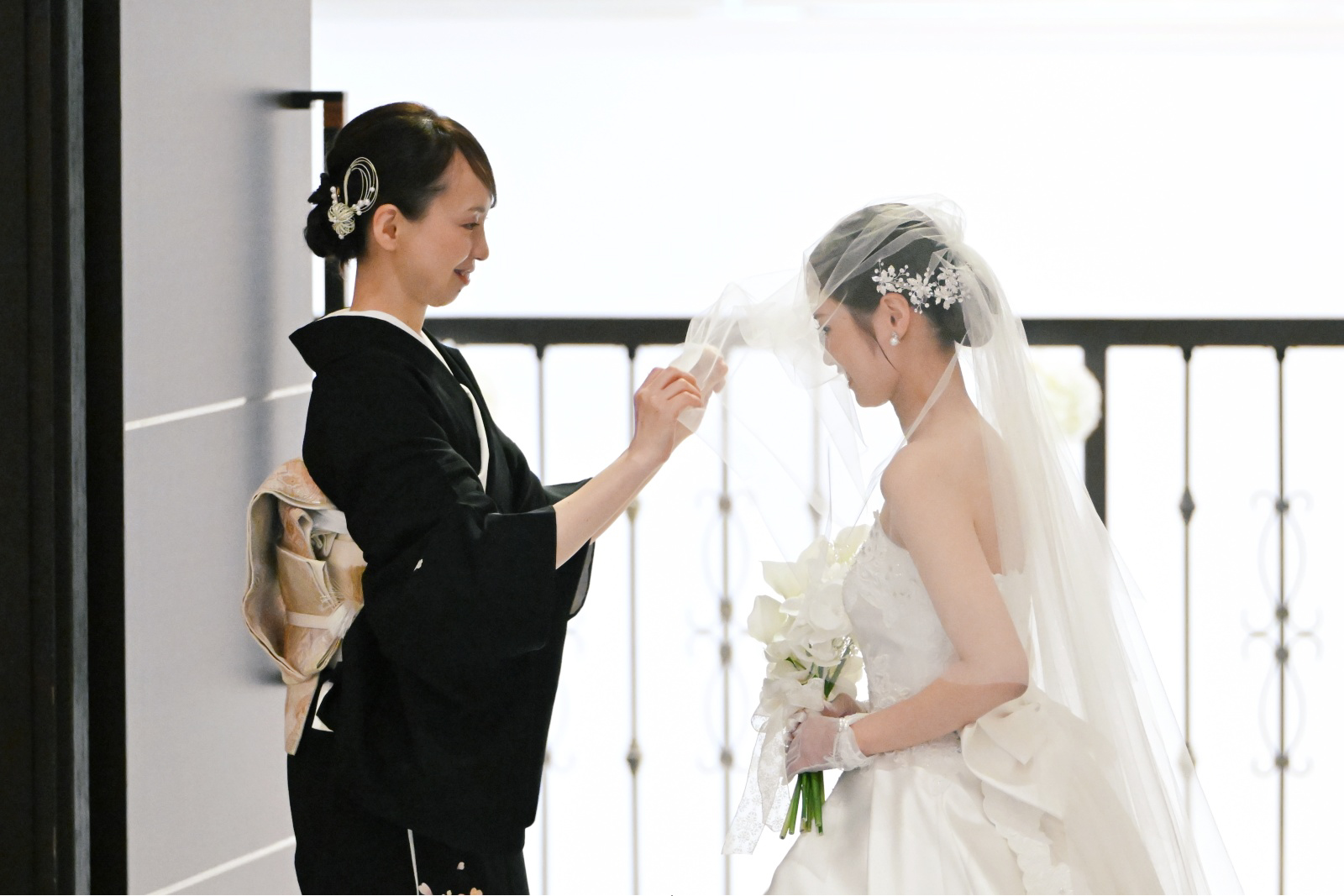お母様によるベールダウン。ベールを下ろし、整えられる様子は、まるでお子様のお出かけ前のお支度をされるようなお気持ちと、子育ての卒業のような複雑な思いも感じられたのではないでしょうか。