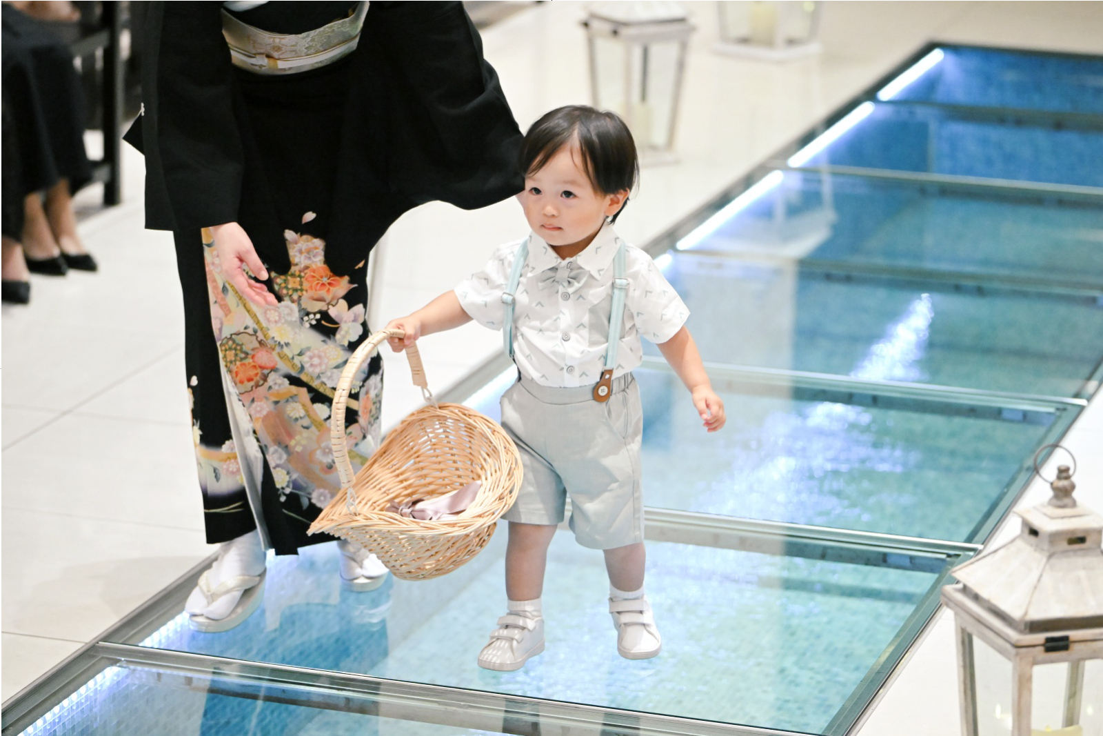 おふたりの可愛いお子様がリングキッズ。おふたりのマリッジリングは入った籠を大事に持って届けてくれました!