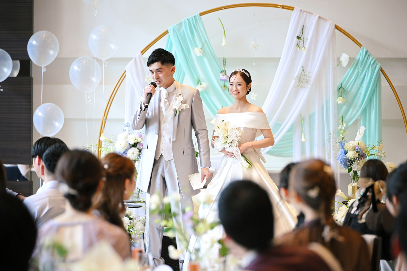 お世話になっているご上司からのお祝いメッセージと乾杯のご発声。引き締まった表情でメッセージを聞かれる新郎様が印象的です。乾杯のご発声で一気に会場も和やかモードに。