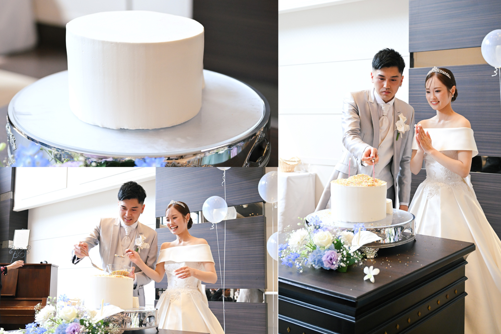 結婚式当日は、おふたりのお子様の2歳のお誕生日でした。おふたりの手で真っ白なケーキにカラースプレーをかけ、お子様が喜ばれそうなポップなケーキに仕上げ、パパの手でろうそくをセット。
