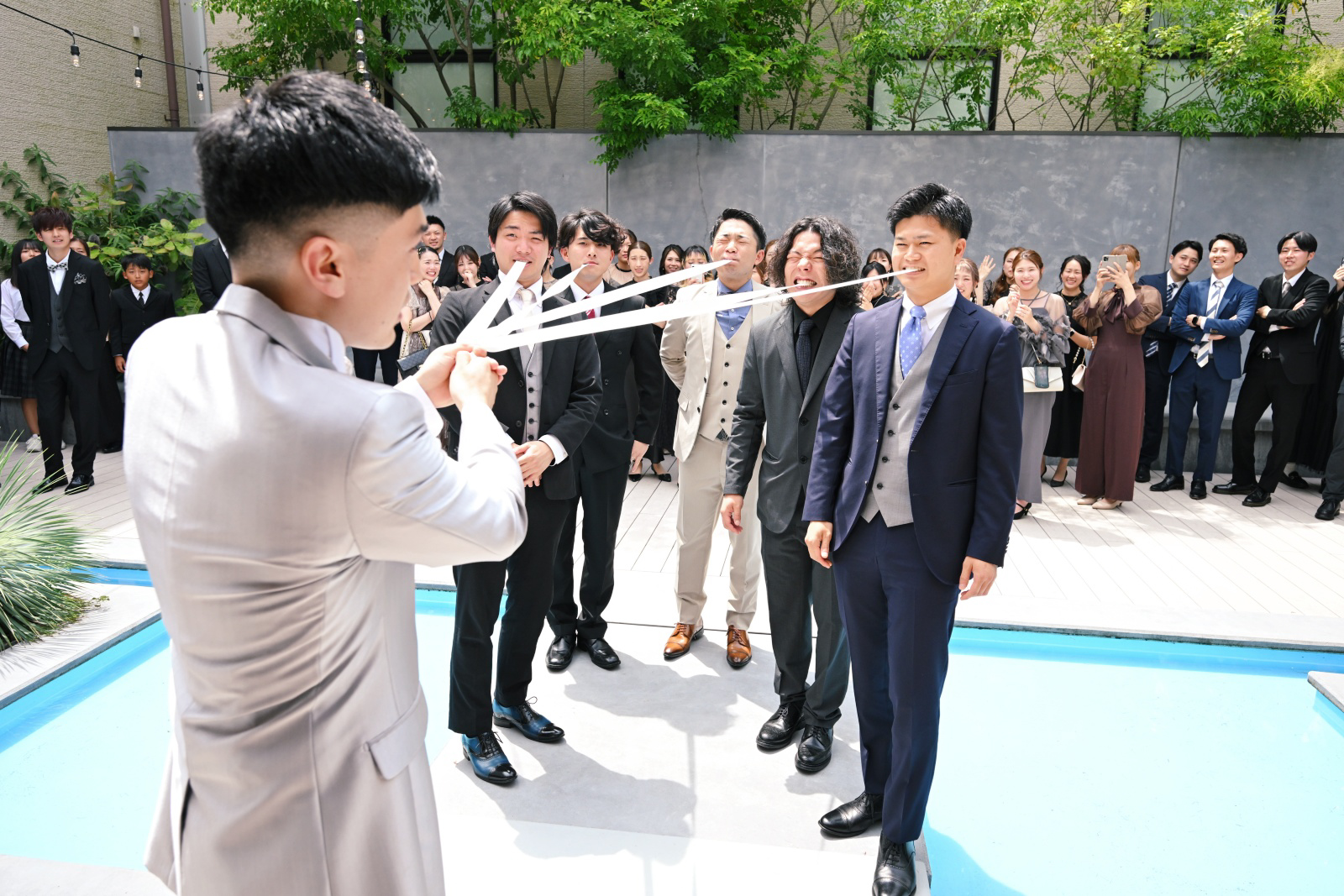 ガーデンでのアフターセレモニーでは女性にはコスメブーケのトスを、男性にはゴムパッチンプルズを。