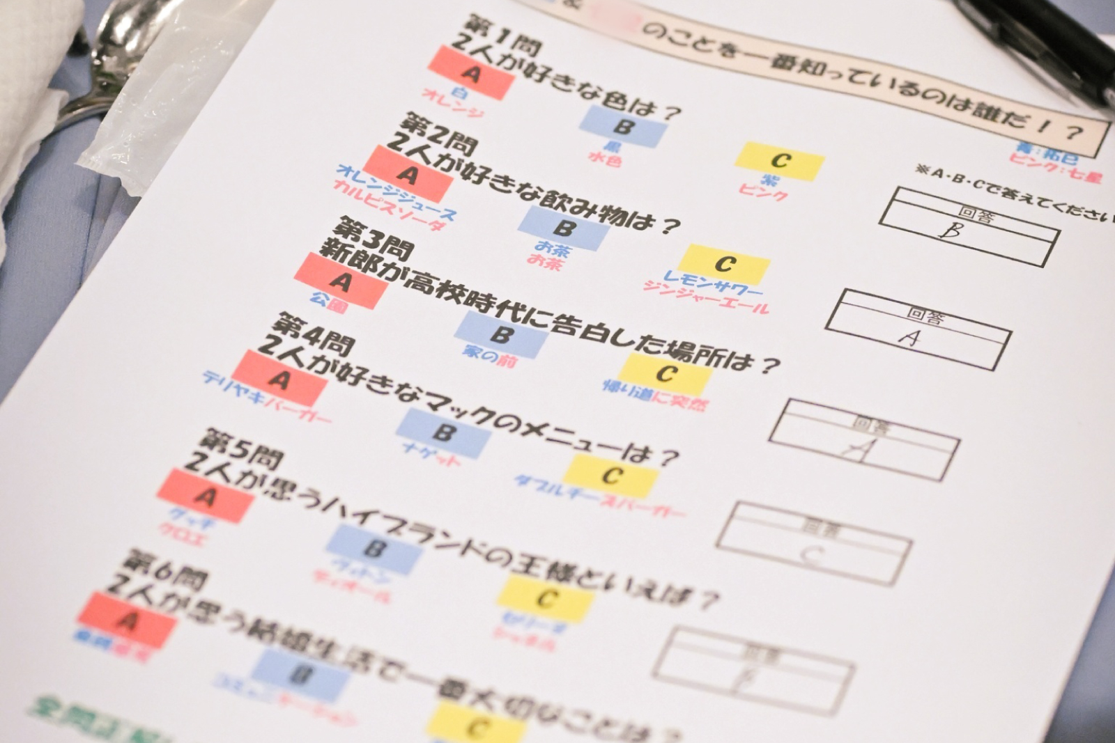 おふたりの退席中にクイズを配布し、シンキングタイム。それぞれテーブルごとに回答を考えておられ、とても盛り上がっていました。