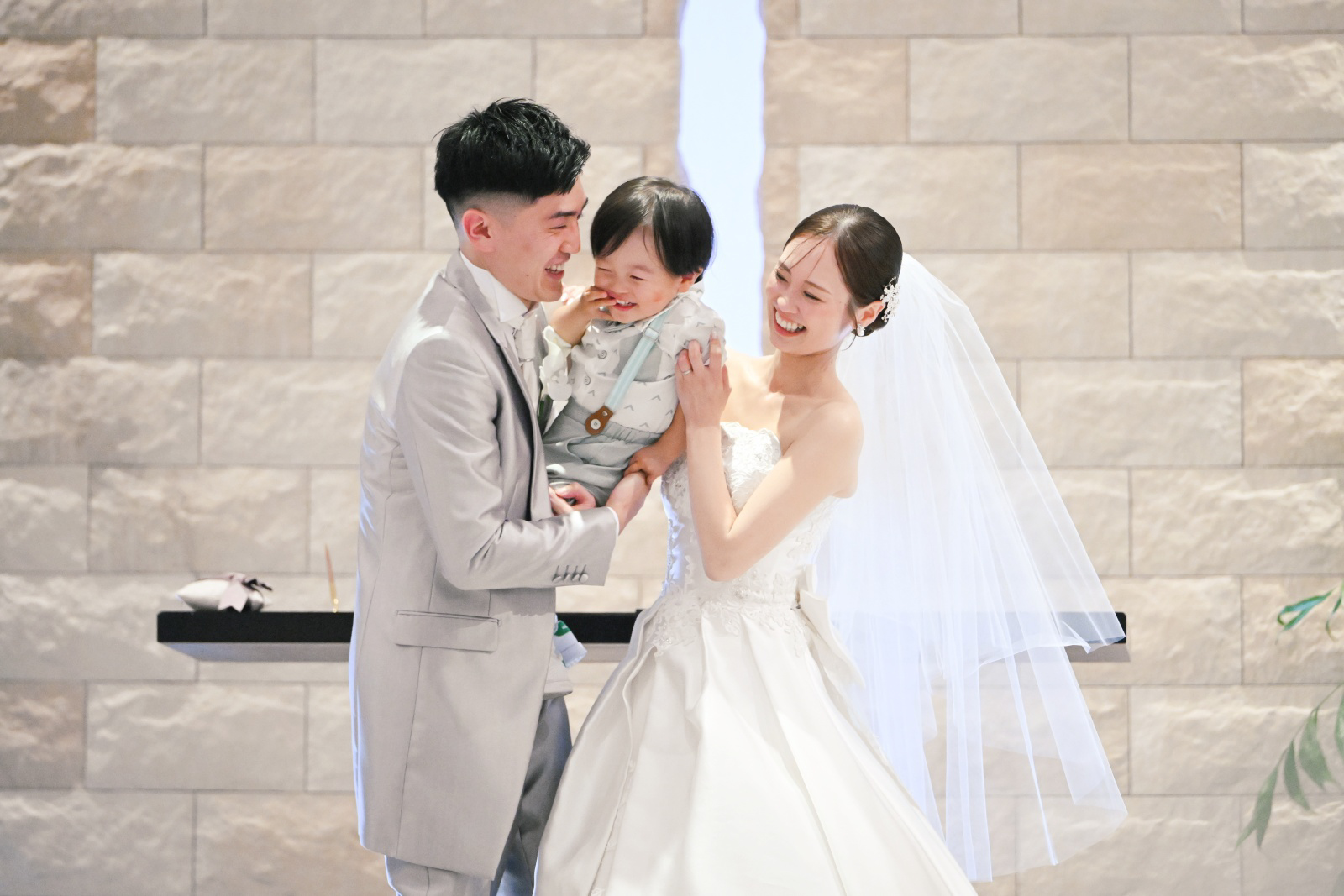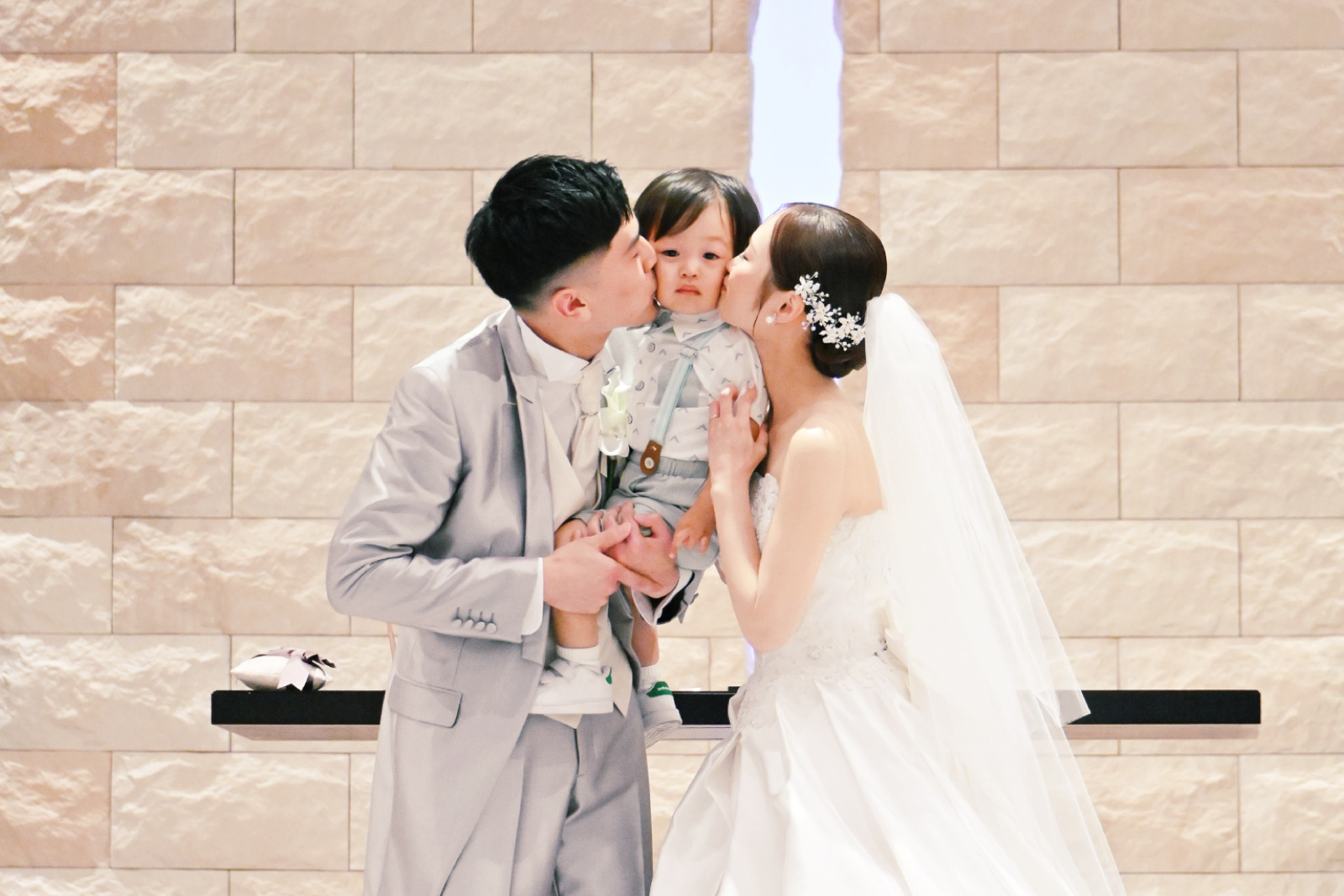 誓いのキスは、我が子のほっぺに。指輪を上手に届けてくれたお礼と、一緒に幸せになろうねという思いを込めてのファミリーキスです。