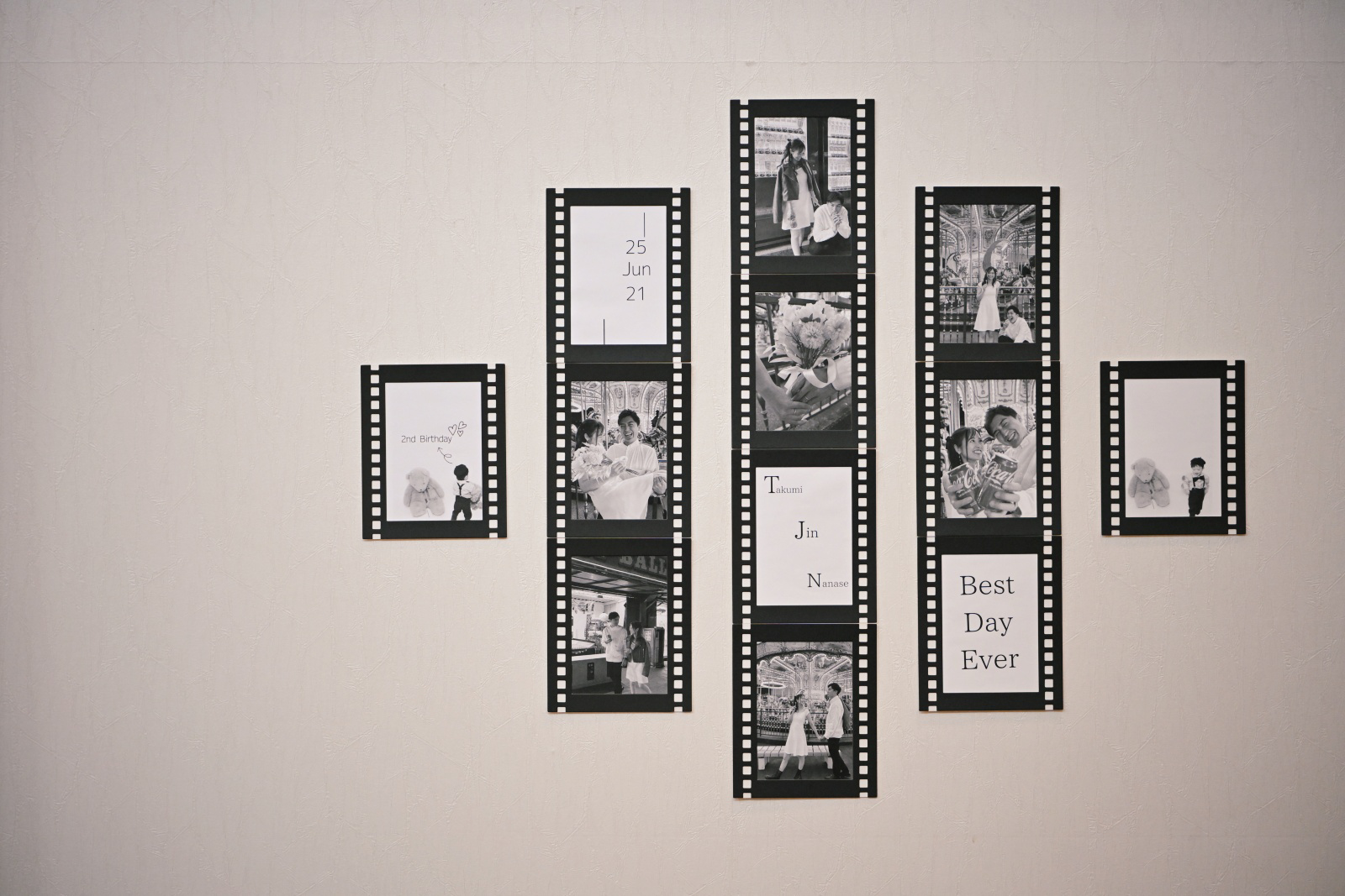 待合いロビーにはおふたりとお子様のフォトギャラリーを。自然な雰囲気のお写真がとてもオシャレです。