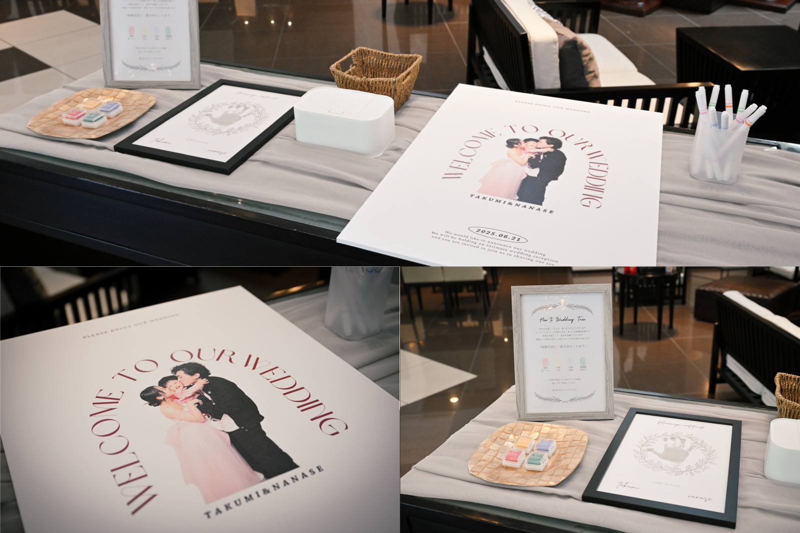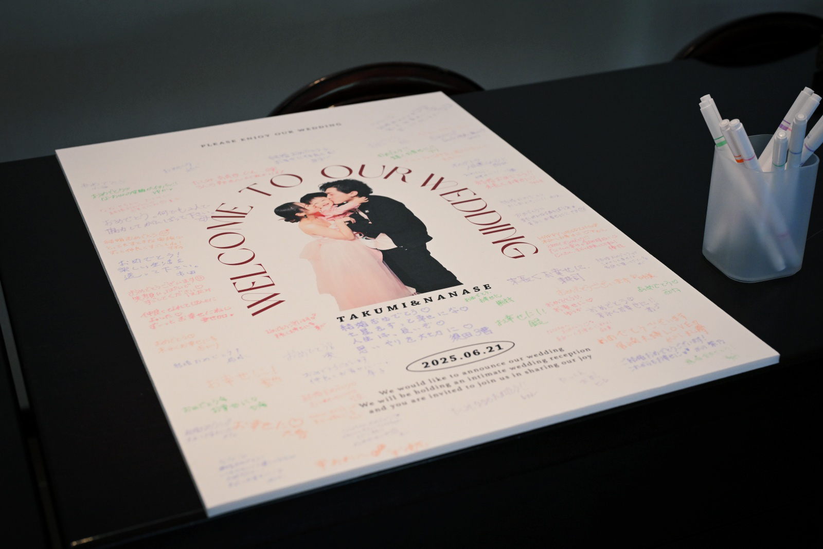 受付に置かれていたウェルカムボードには、ゲストの皆様からの温かいメッセージが。素敵なボードに仕上がりました。
