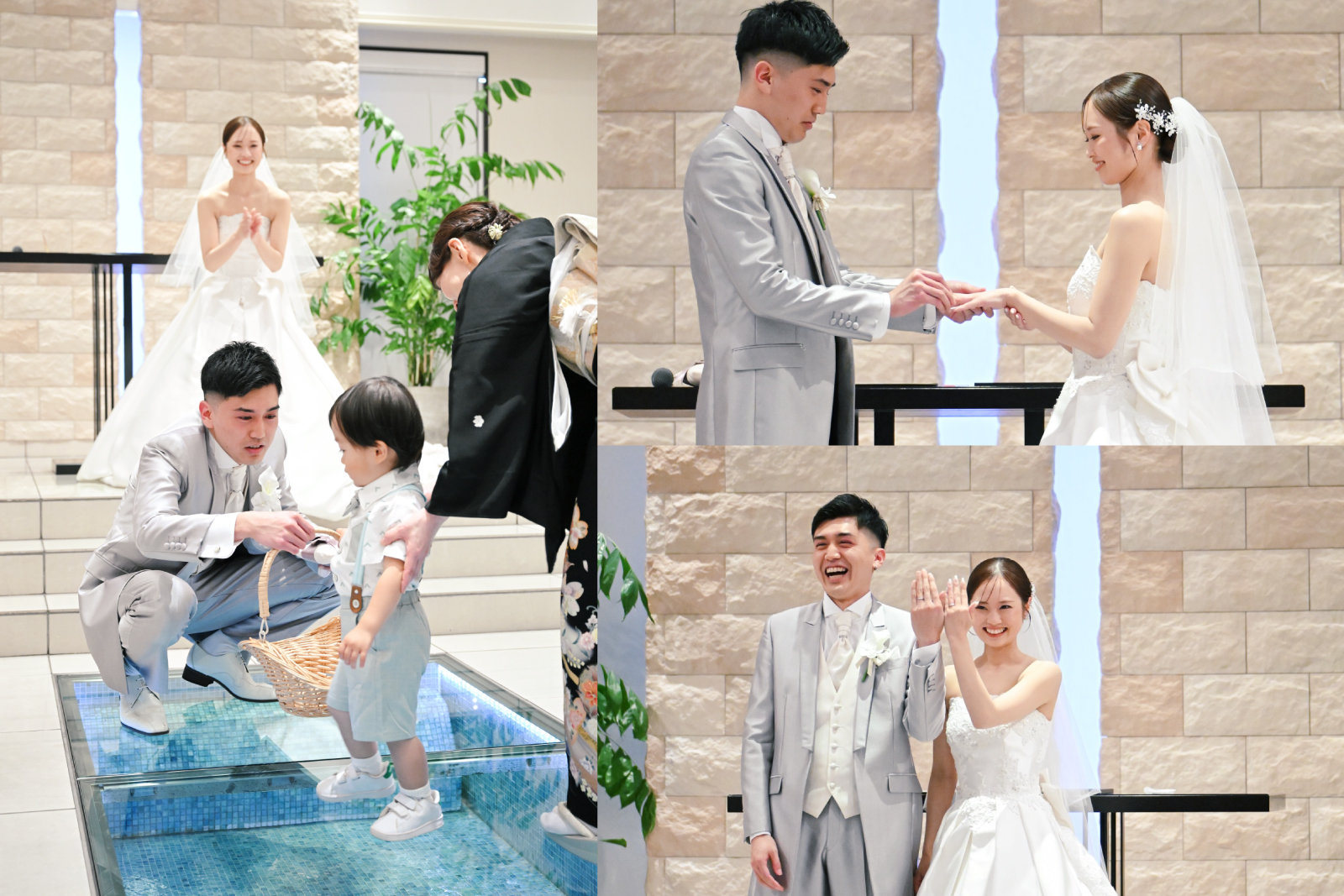 可愛い我が子が届けてくれたマリッジリングを受け取り、お互いの指にはめてゲストの皆様へ披露されました。