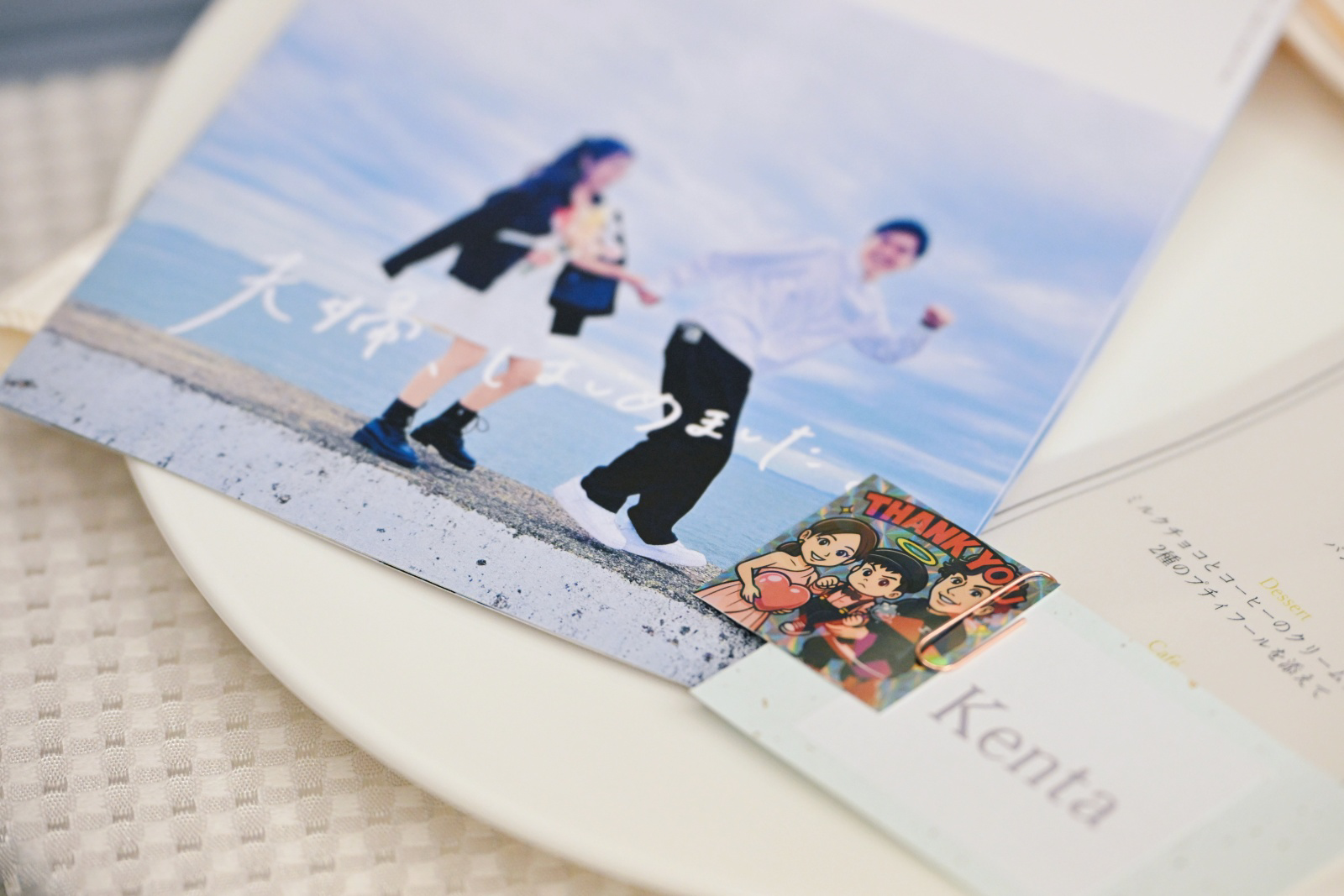 ゲストのお席には、おふたりのプロフィールブックを。おふたりがご入場されるまでの間も、ゲストの皆様を退屈させないようにするためのおふたりのおもてなしのペーパーアイテムです。