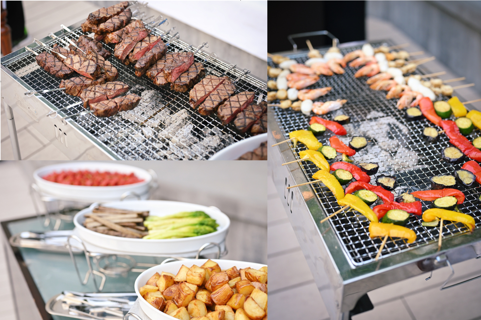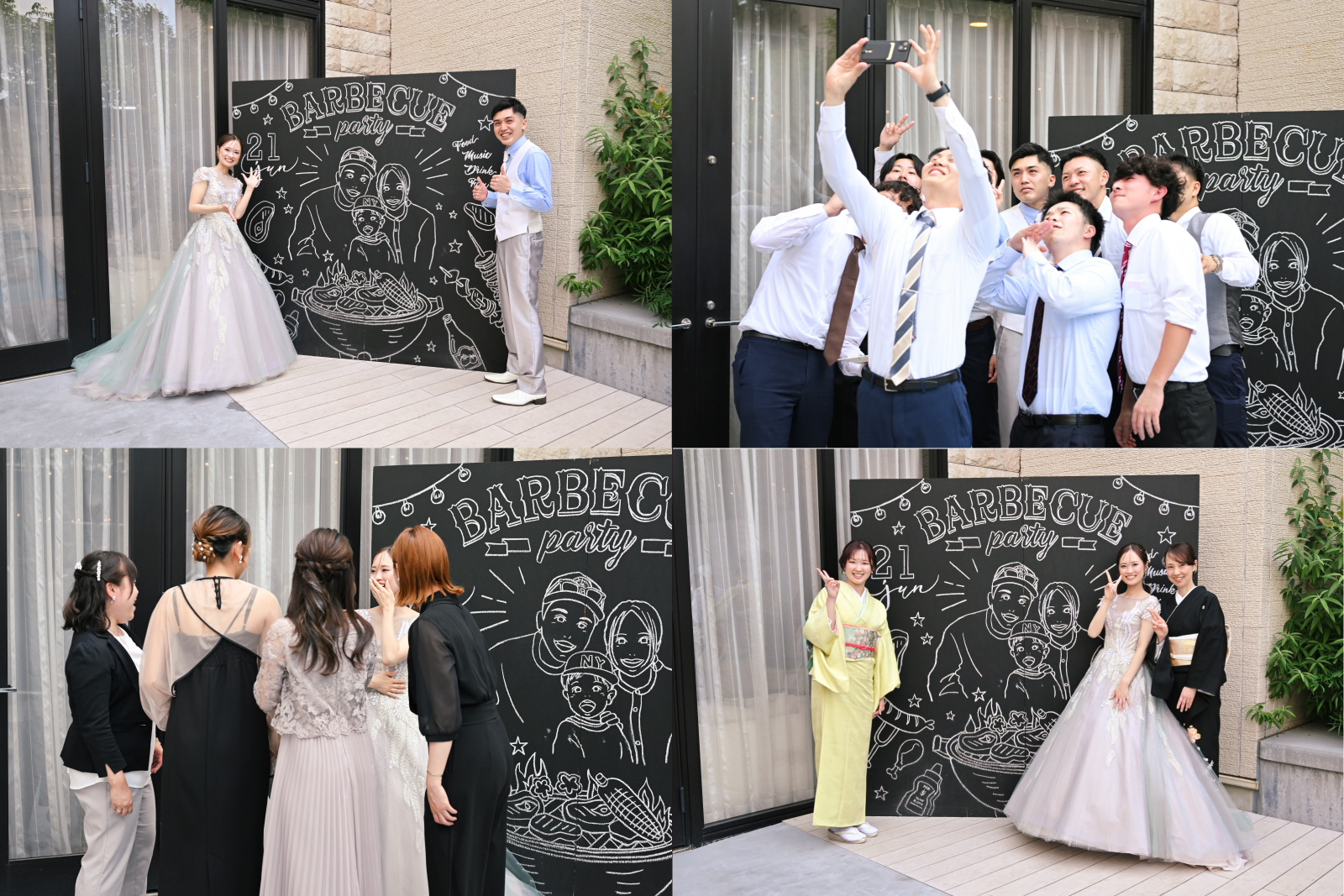 クイズの正解発表に続きメインイベントはガーデンでのBBQブッフェ&歓談タイム。新郎様は、式場のご見学の時から、このBBQイベントを楽しみにされていました。楽しみにしすぎて、先にこのイベントについて周囲の方に言ってしまわれるほどです。