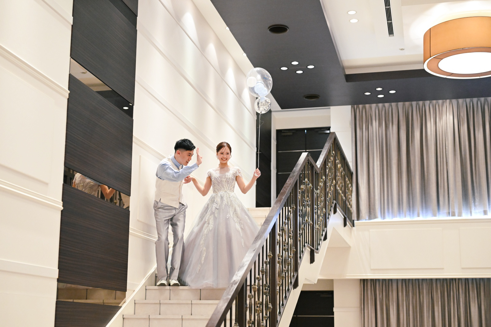 お色直し後のご入場はシンデレラ階段から。新婦様はブーケの代わりにバルーンを手に。