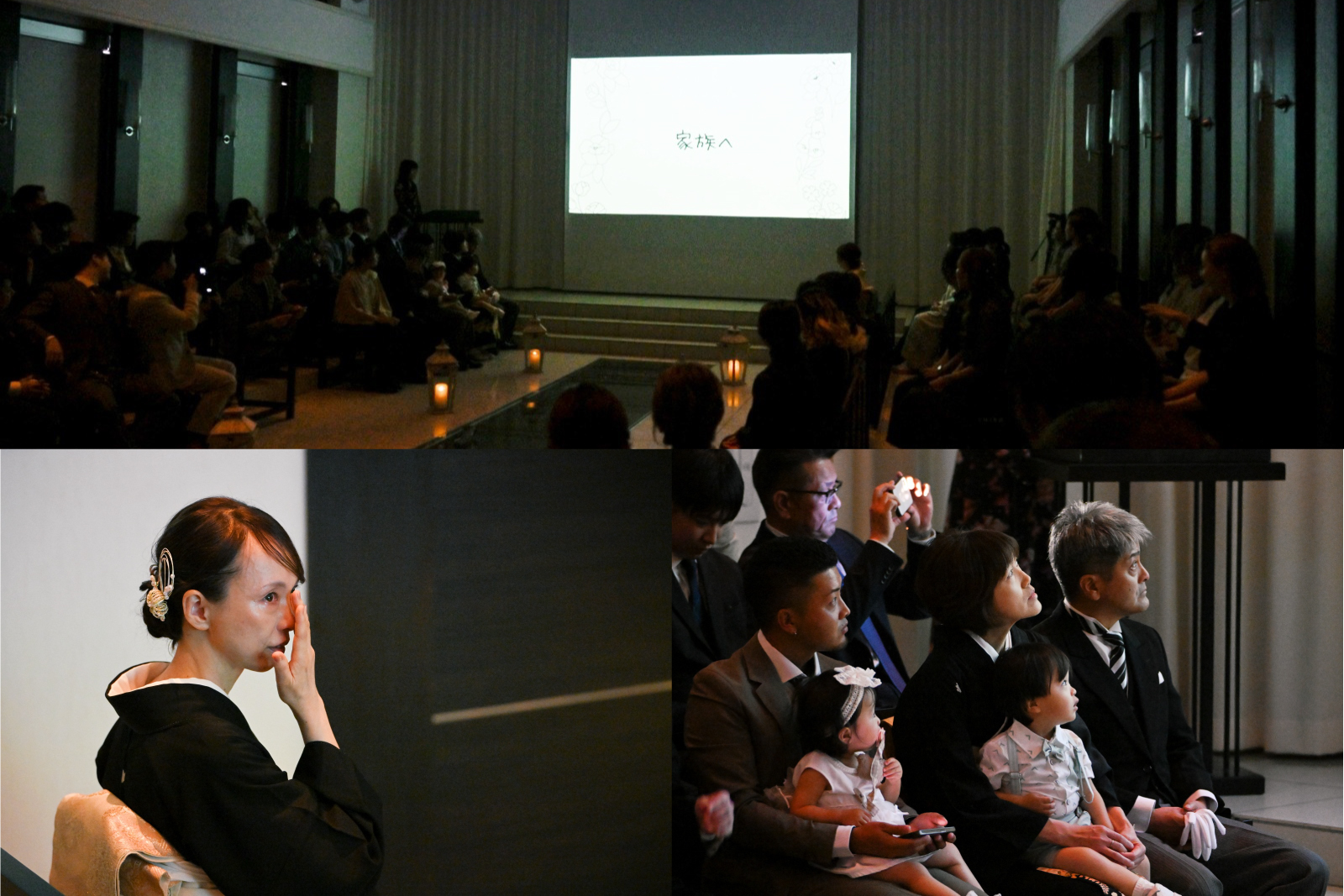 挙式がスタートする前。ご家族に向けた感謝の映像を上映されました。ご入場前の上映は、さらに気持ちが高ぶり、親御様も様々な思いが溢れて込み上げるものがあったと思います。