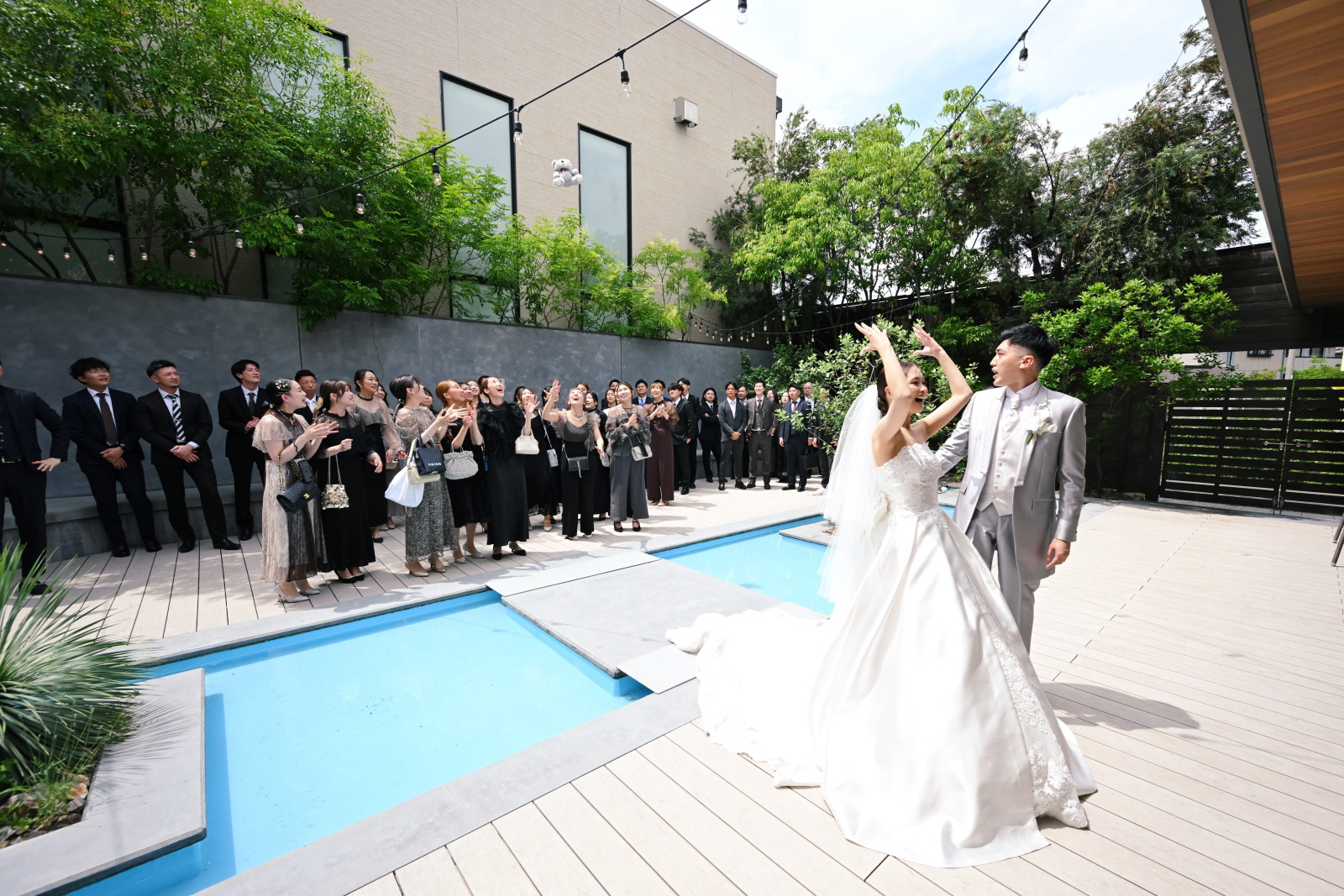 パーティーラストのご退場は、ゲストの皆様が作ってくださる花道を通って。フラワーシャワーのように、近くで「おめでとう」と「ありがとう」が行き来する素敵な空間です。そしておふたりにもゲストにも記憶に残る退場シーンになったと思います。