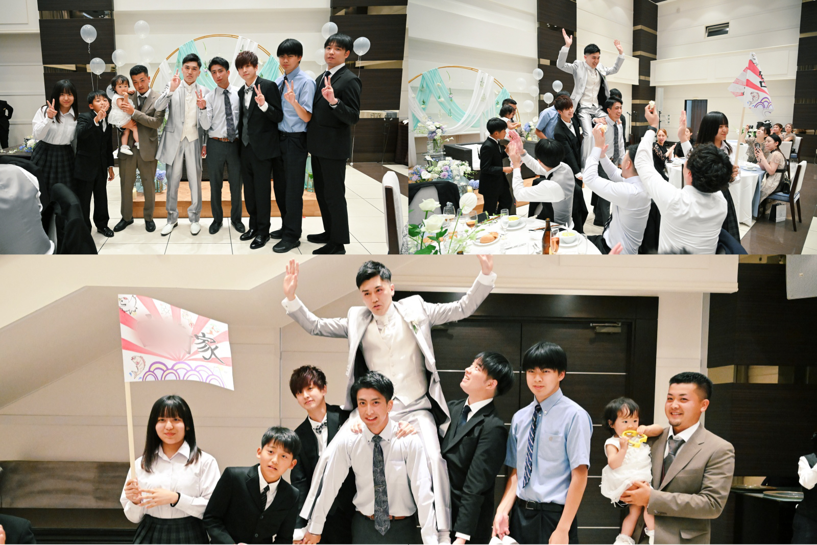 新郎様のお色直し退場は、弟様や従弟様などご親族の皆様が盛り上げて下さいました。騎馬を作り、歌や楽器演奏で盛り上げながらのご退場です。ご家族、ご親族の絆を感じられる素敵な演出です。