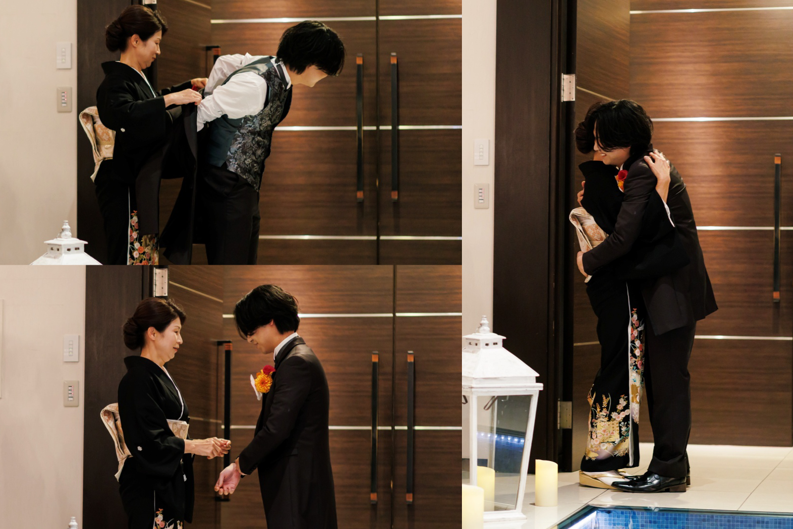 ジャケットセレモニー。ジャケットを着せてもらい、整えて頂く。そしてハグされるお母様と新郎様のご様子は、とても温かく思わず笑顔になる瞬間です。