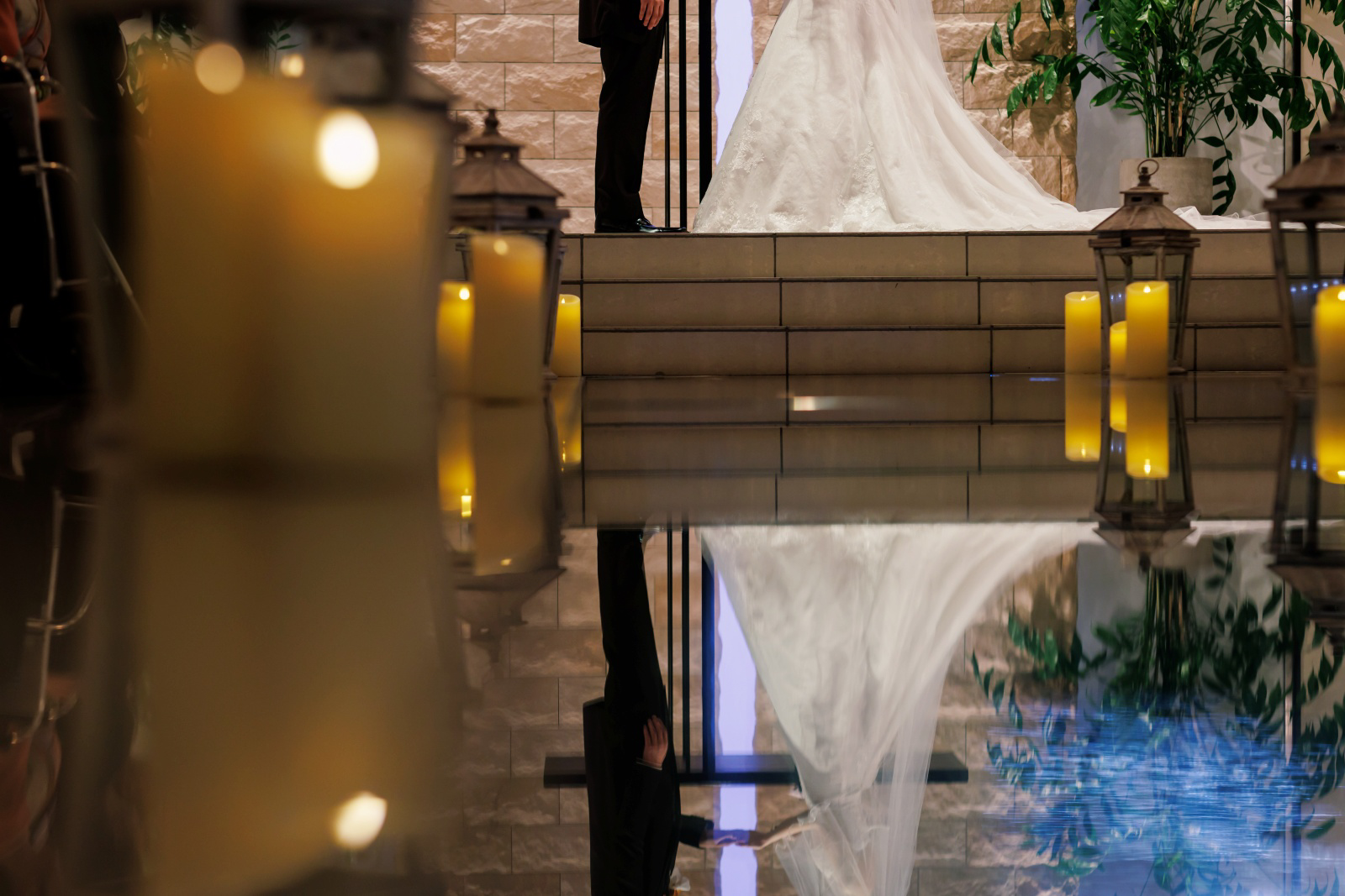 バージンロードにはおふたりの姿が反射してとても幻想的な雰囲気です。