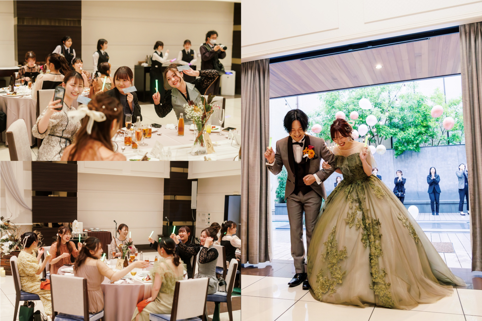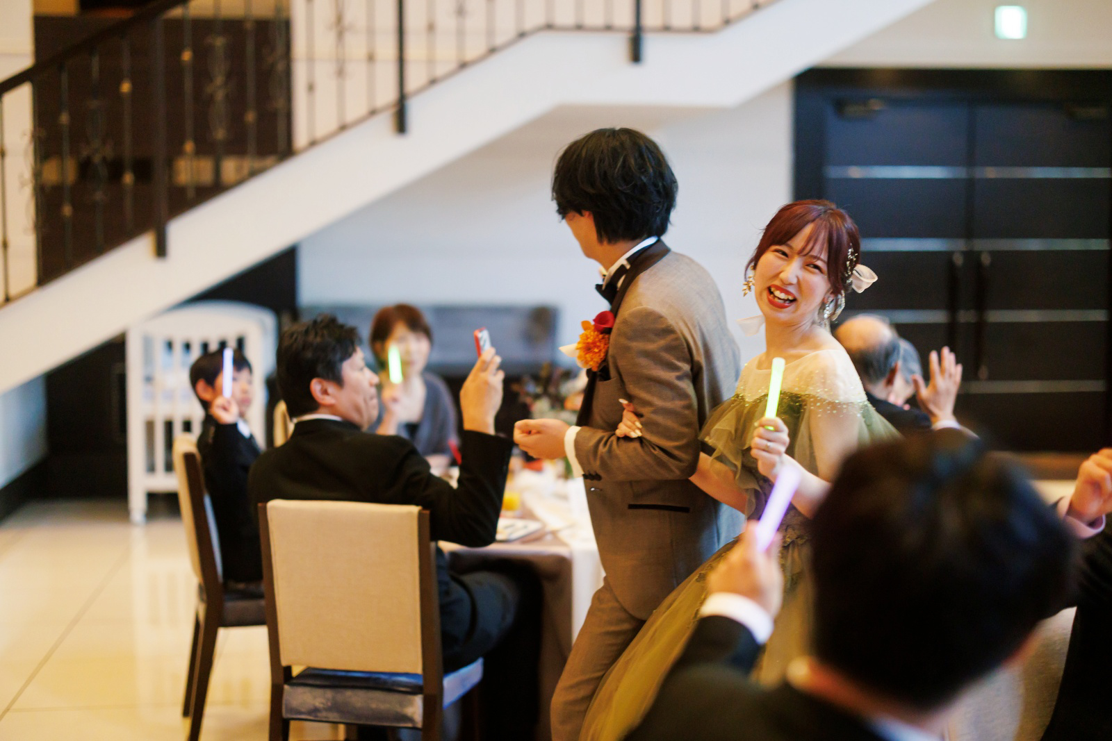 お色直しのご入場は、カラードレスの色当てクイズの正解発表も兼ねて♪ゲストの皆様は受付でお取りになったペンライトを振って盛り上げて頂き、おふたりは正解のカラーのペンライトをもってご登場です。