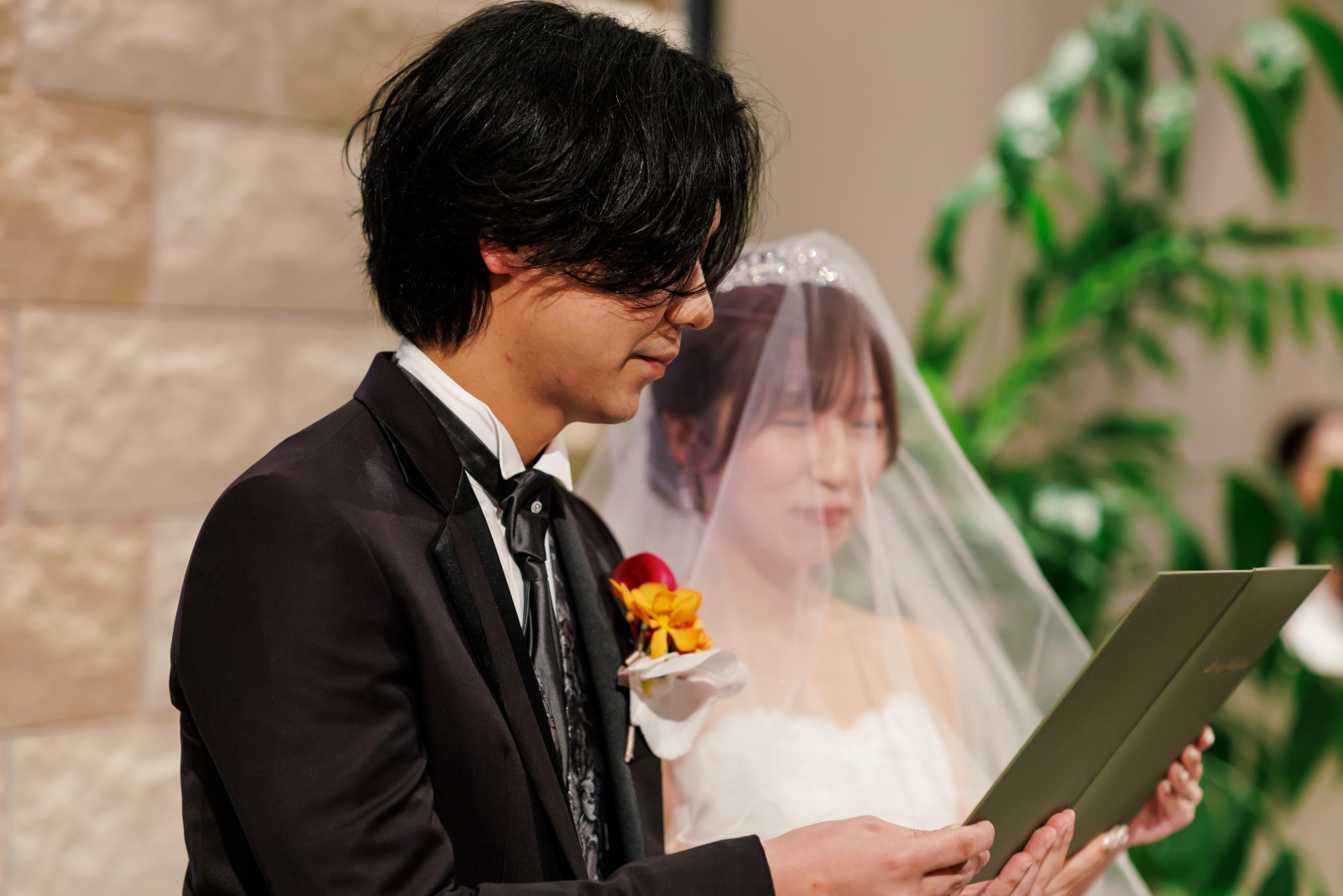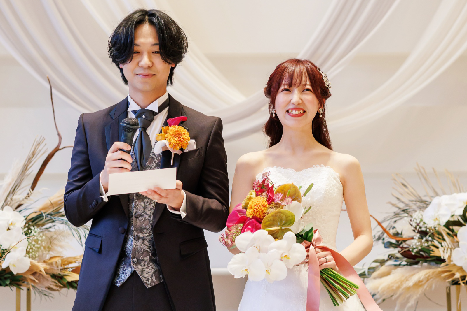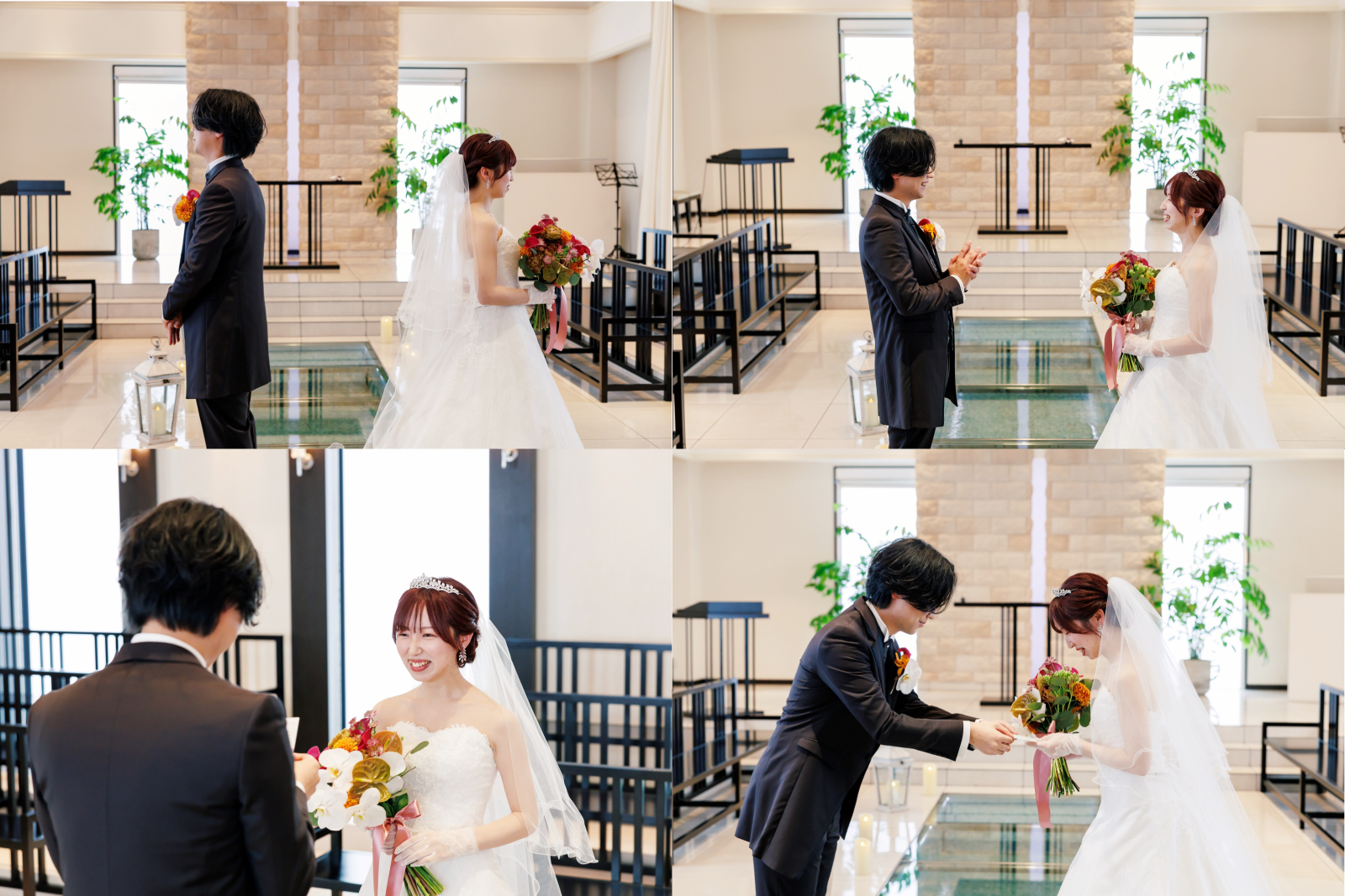 新婦様が入場されてきて背中合わせに立ち、一緒に振り向くスタイルです。新郎様からは新婦様へサプライズでお手紙のプレゼントを。