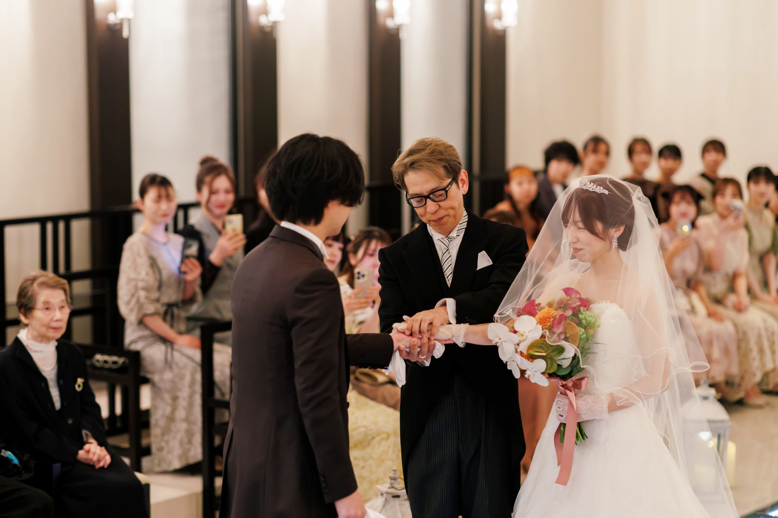 ゲストが見守られる中、おふたりの誓いや、指輪の交換など人前挙式が進んでいきます。