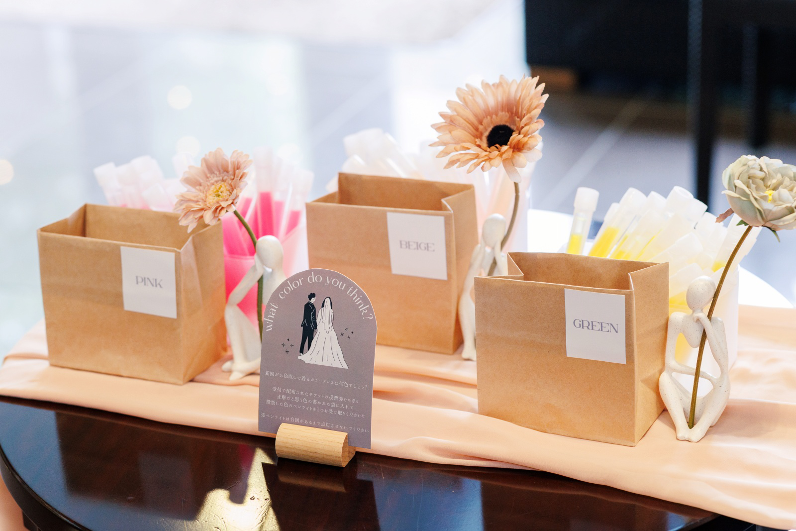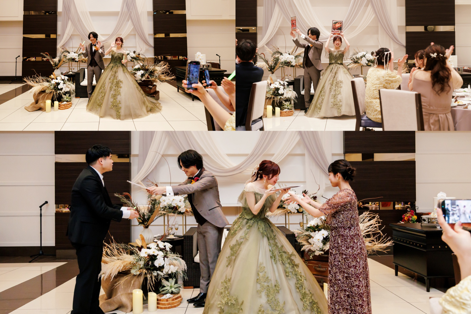 色当てクイズの正解者の中から、最終お二人の方にプレゼント♪お色直しのご入場から発表まで盛り上がった演出になりました。