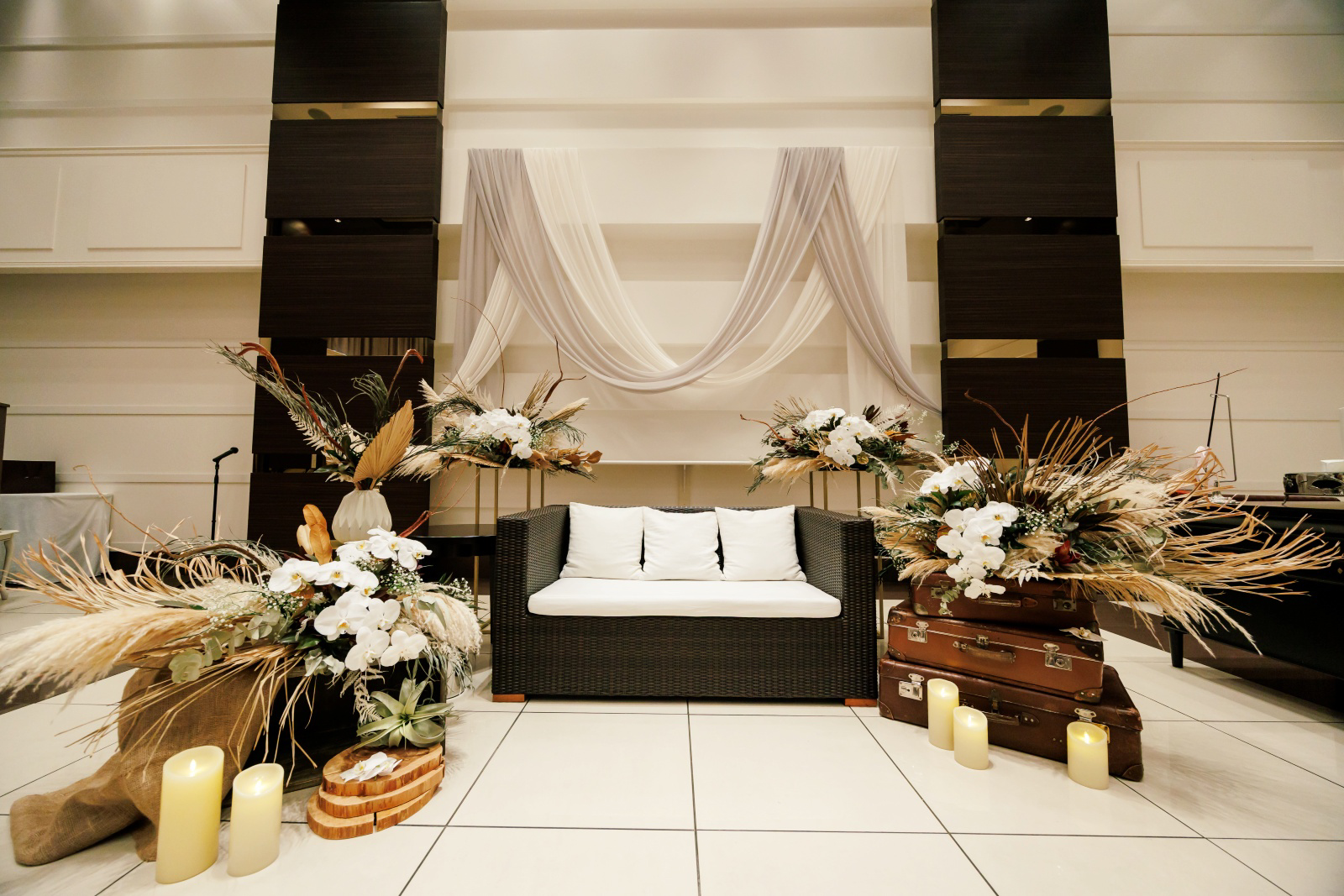 パーティー会場のメイン席はソファ席で。こだわりのコーディネートはお写真にも映え、ゲストからも好評でした。