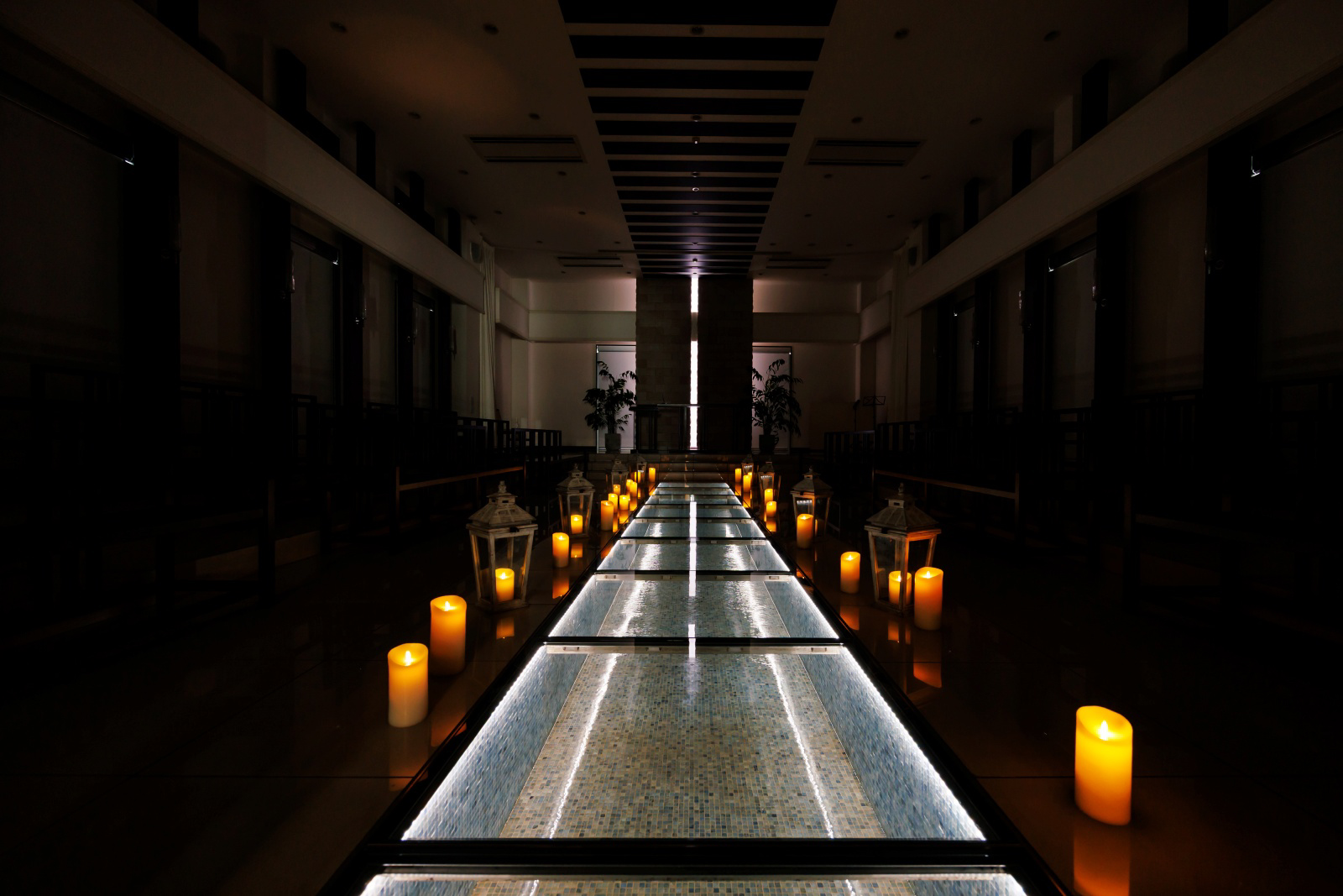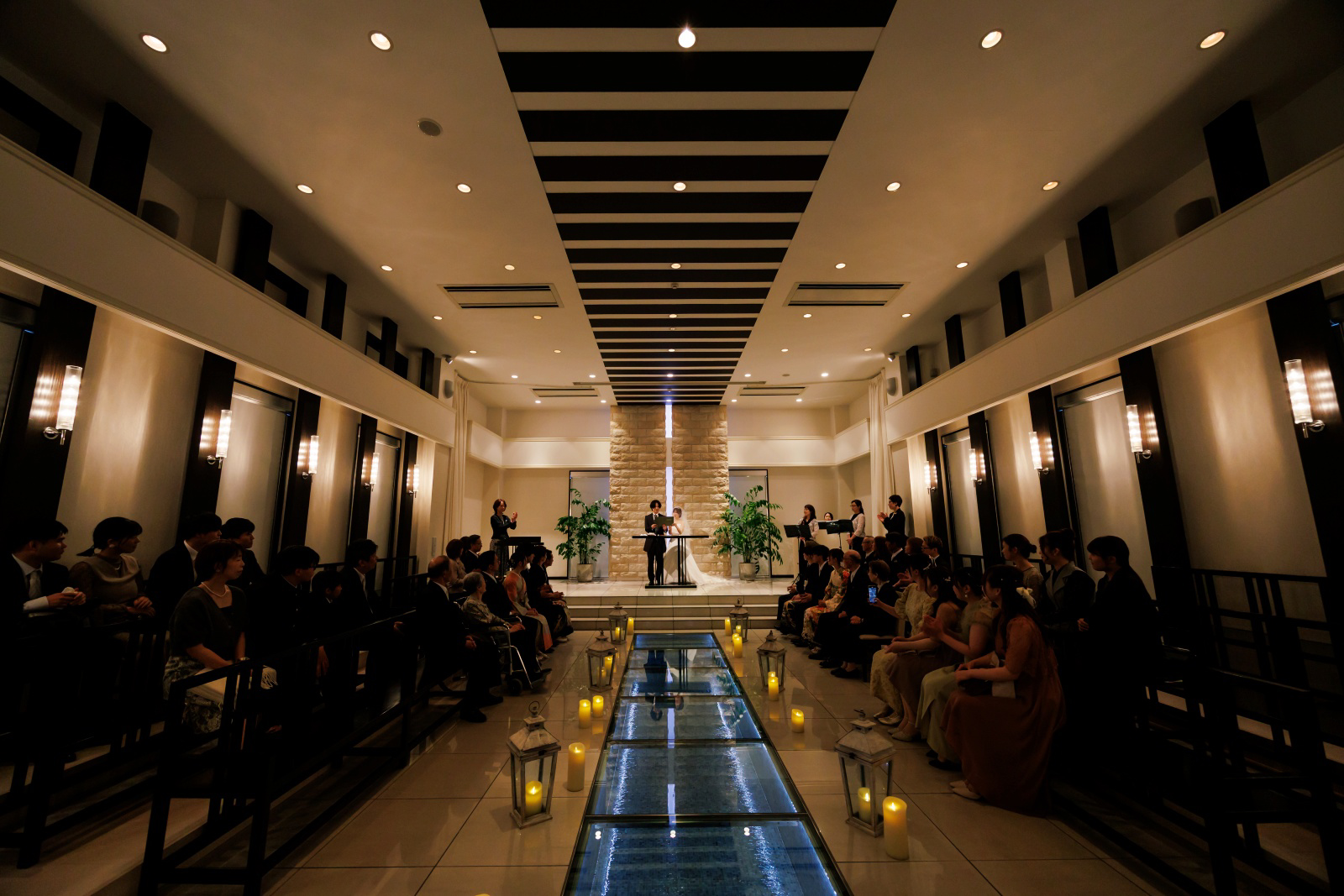 チャペルのバージンロードにはランタンとキャンドルを。明暗の雰囲気を楽しめるチャペルです。