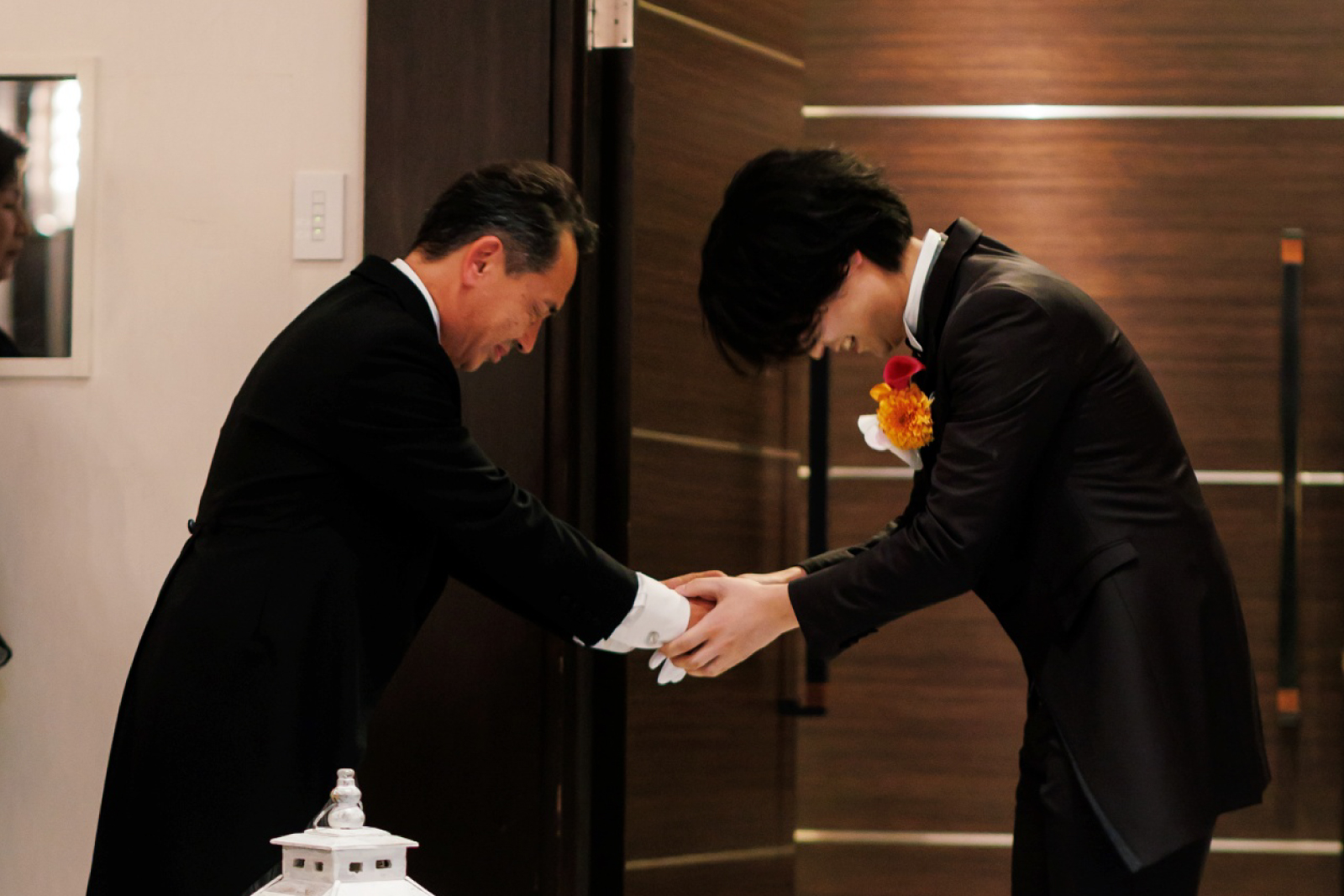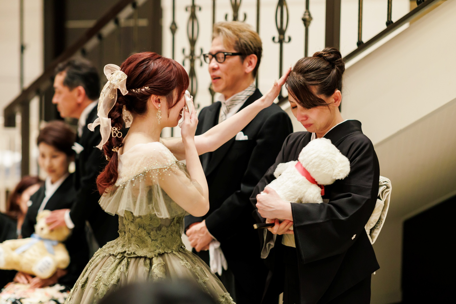 大切に育ててこられたお嬢様をお父様から新郎様へ託されるとき。おふたりの手を包み込むお父様の気持ちが聞こえてくるようです。