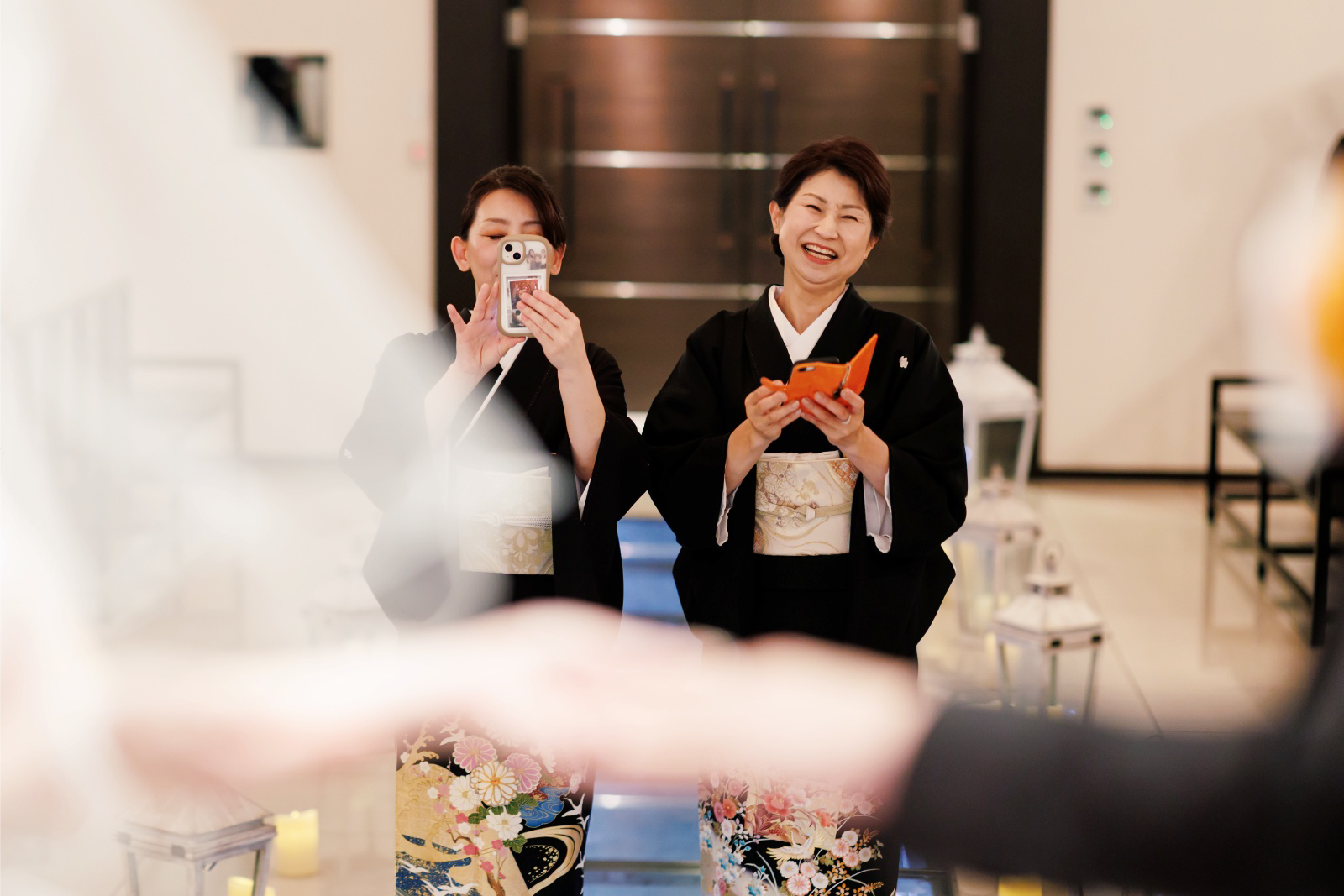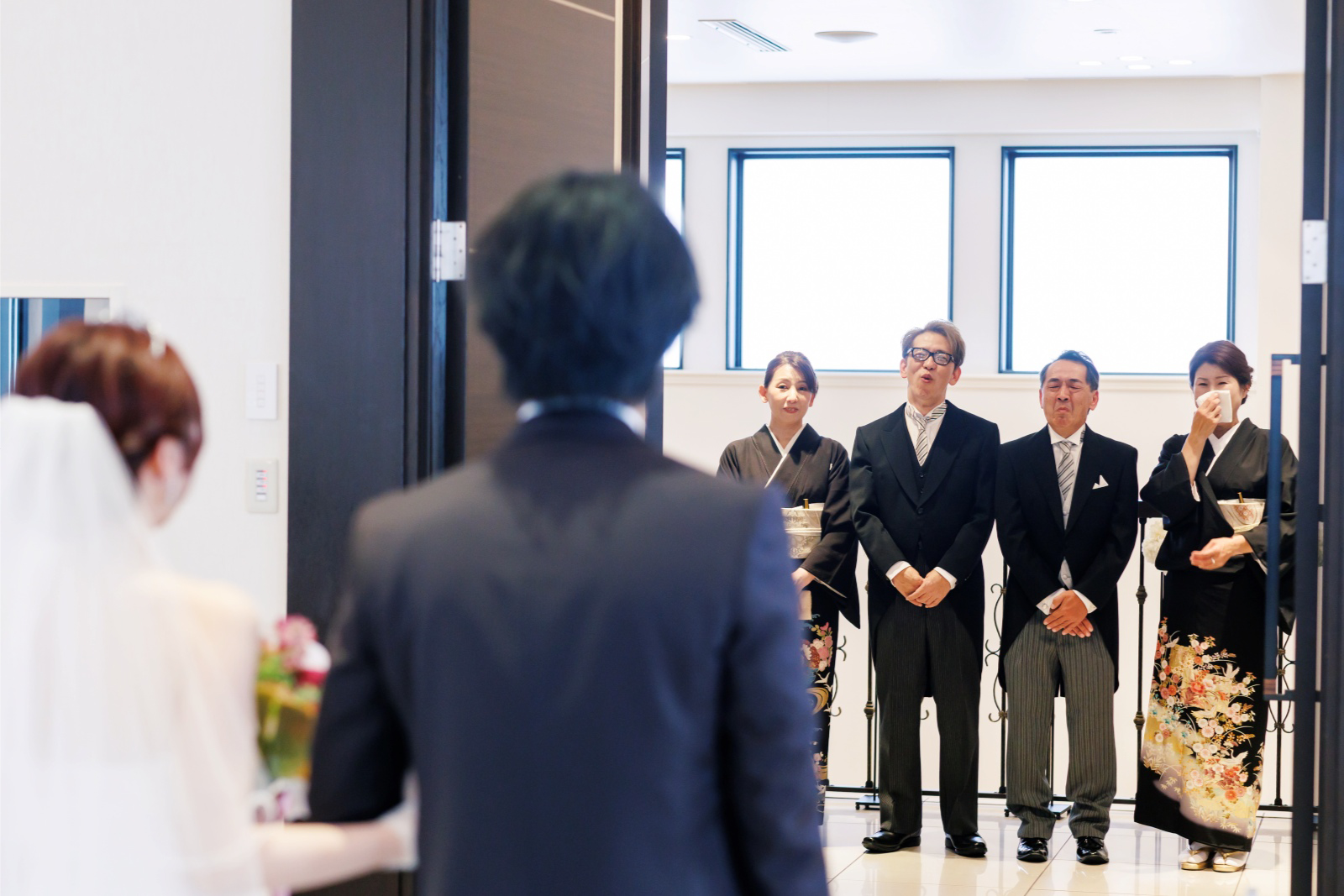 親御様とのファミリーミート。扉が開き、おふたりの姿を目にされた瞬間から涙ぐまれているお母様達。この瞬間をとても楽しみにしておられたのだと思います。