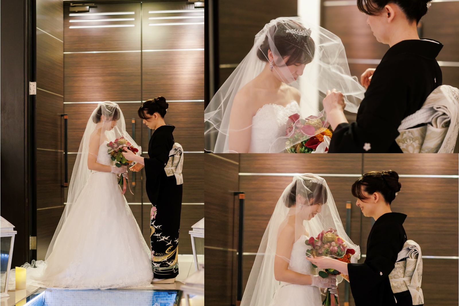 ベールダウンでは何か小さく話しかけられるような新婦様とお母様の距離感がとても素敵です。言葉はなくても、お互いの気持ちは伝わっていると思います。