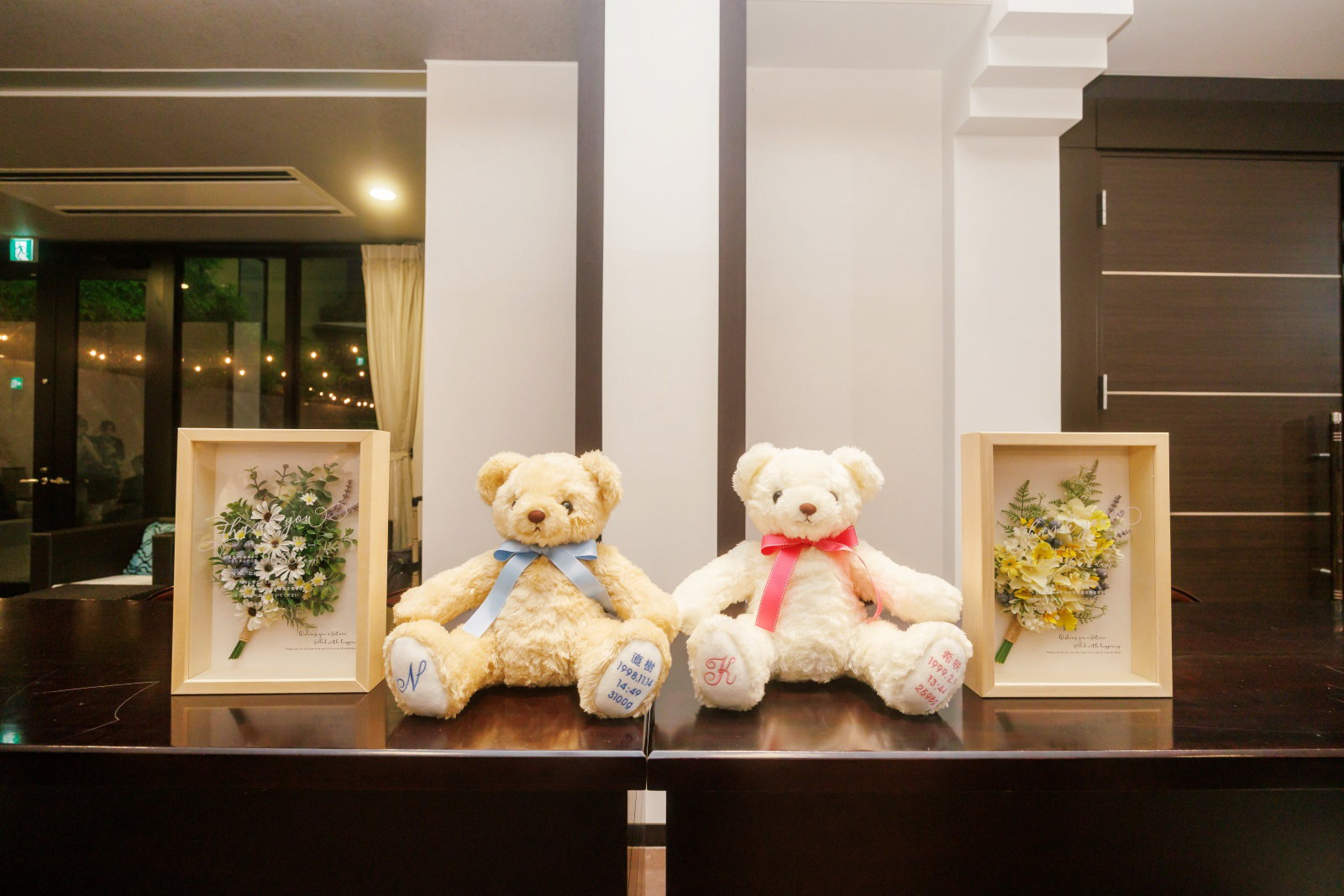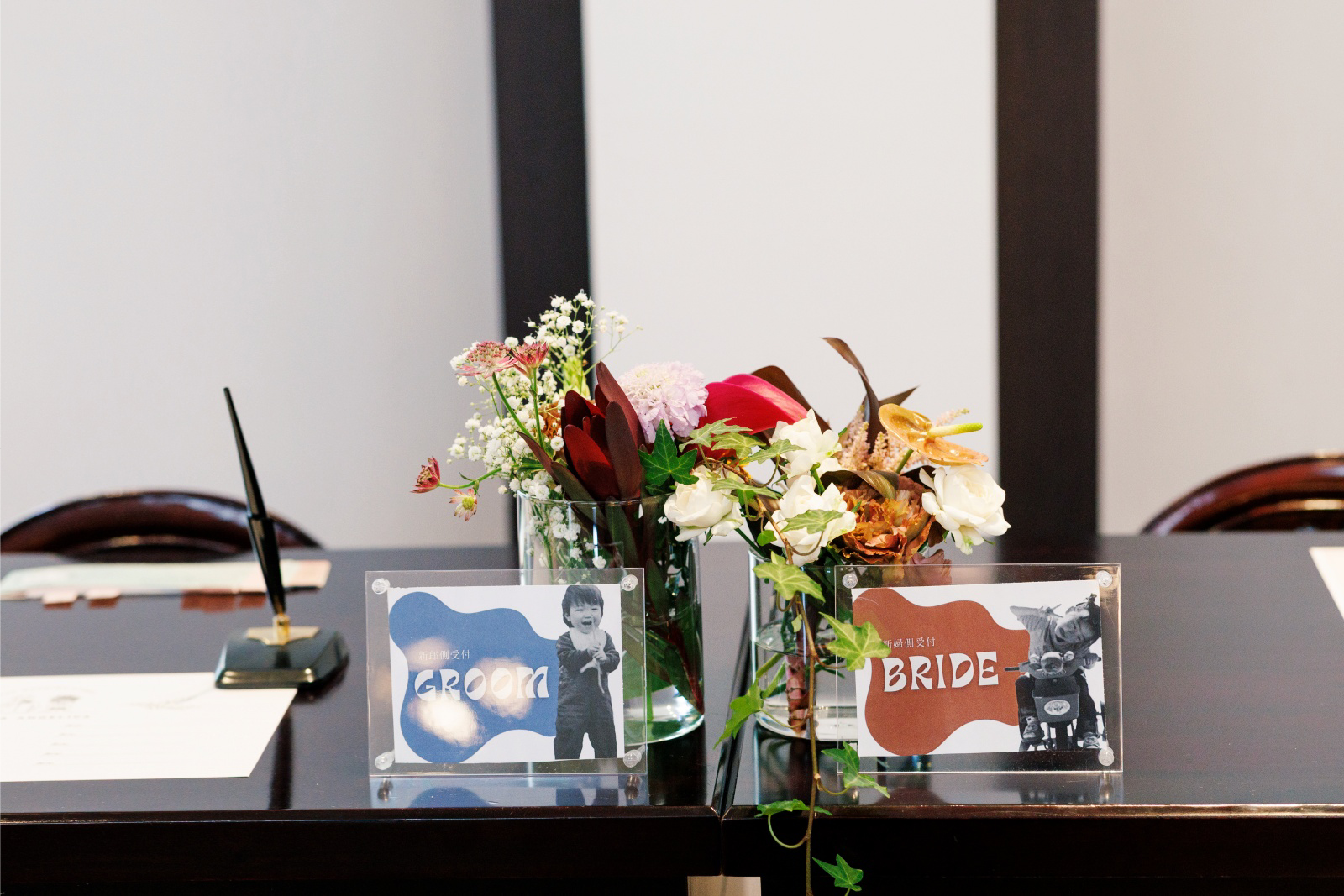 受付のプレートは、おふたりの幼い頃のお写真を。ご親族様にとっては懐かしいお写真。ご友人様にとっては知らない一面を見ることが出来るお写真。ゲストにとっては笑顔になるお写真。おふたりのゲストに楽しんで頂きたいと思う気持ちが表れたアイテムですね。
