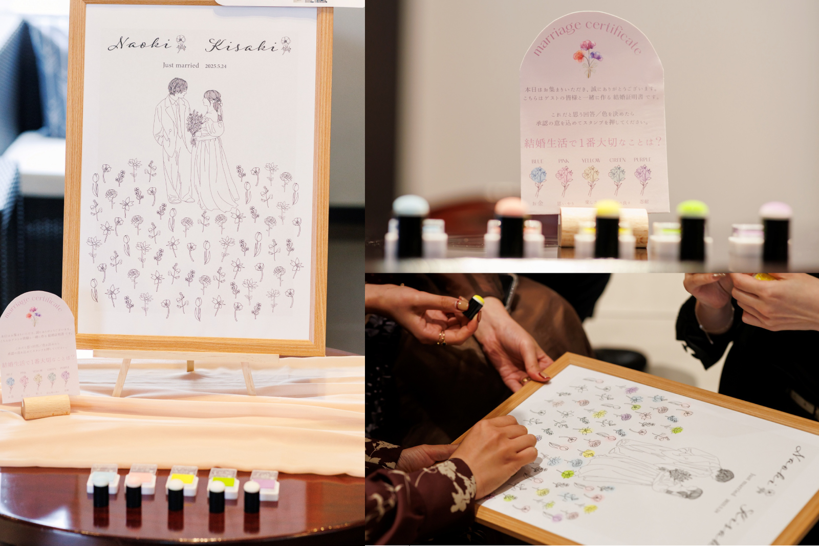 オリジナル結婚証明書にゲストからのスタンプを。新婦様のご友人様が描かれたイラストがとても素敵ですね。新婦様にとってこのご友人様に依頼されるのは学生時代からの夢だったそうです。