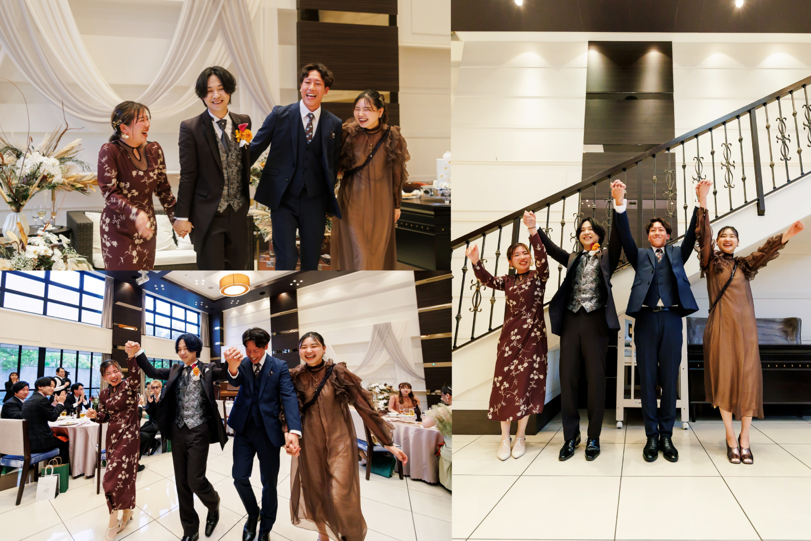 新郎様のお色直し退場のエスコ―ト役に指名されたのは、新郎様にとってはいろいろな経験を一緒にしてきたアルバイト仲間の皆様。息もぴったりで笑顔が素敵な演出ですね。