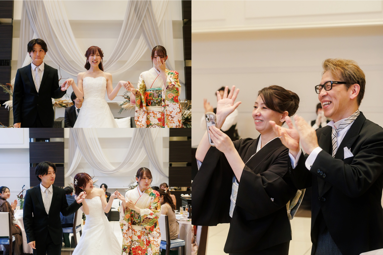 新婦様のお色直し退場は弟様と妹様と一緒に。とても仲の良いご関係だそうですが、親御様にとってもうれしい3ショットだと思います。素敵なサプライズ演出ですね。