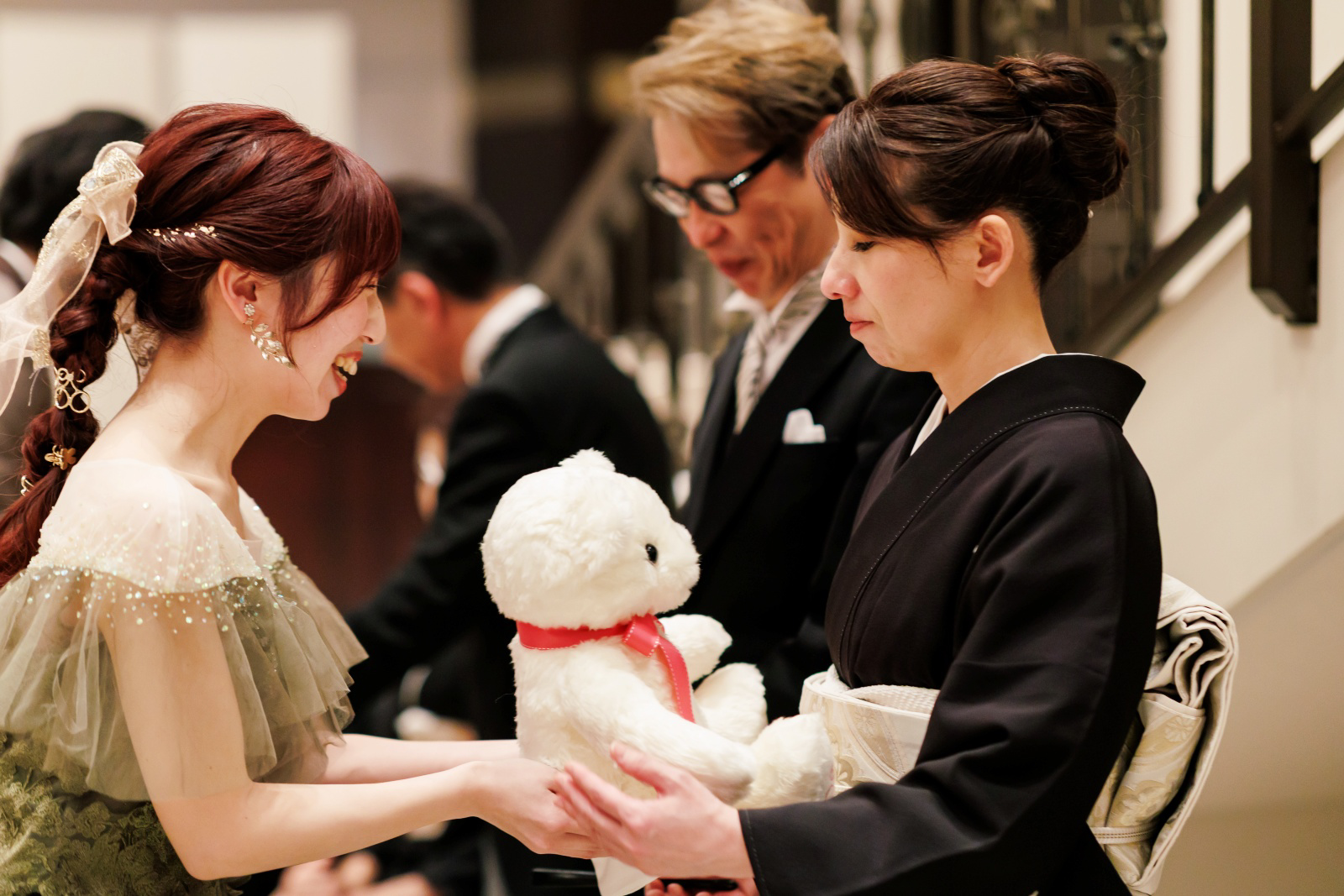 お母様へは結婚を機に巣立たれたおふたりの代わりに、体重ベアをプレゼント。懐かしい重みを感じられたお母様。