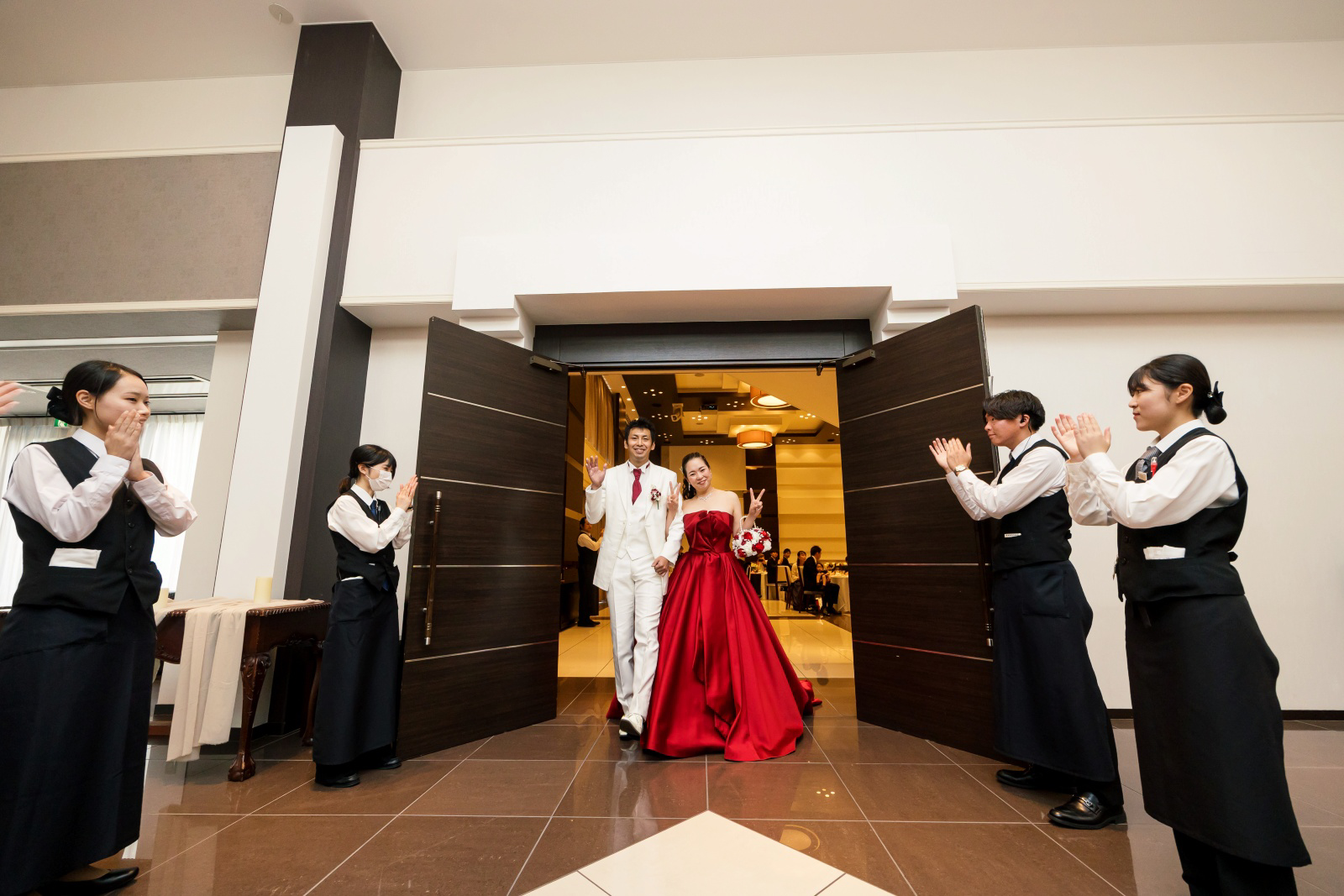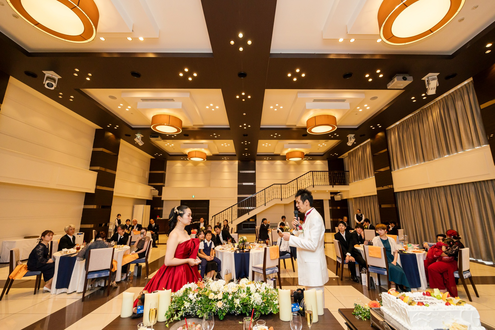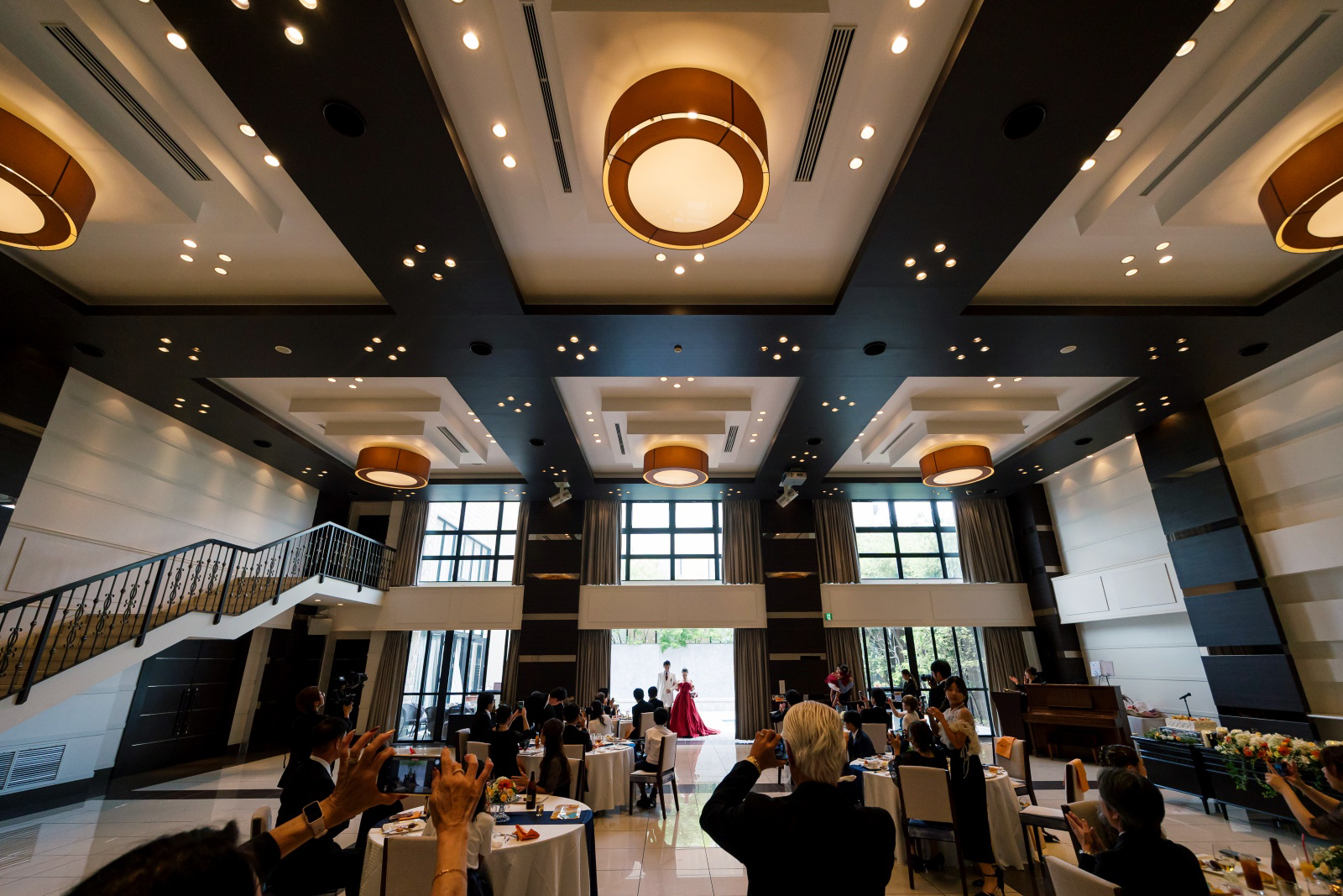 まずは2階のシンデレラ階段からのご登場。ゲストに笑顔で手を振るおふたり。パーティースタートから、楽しんでおられます。