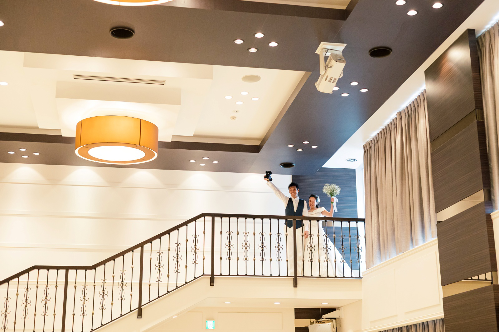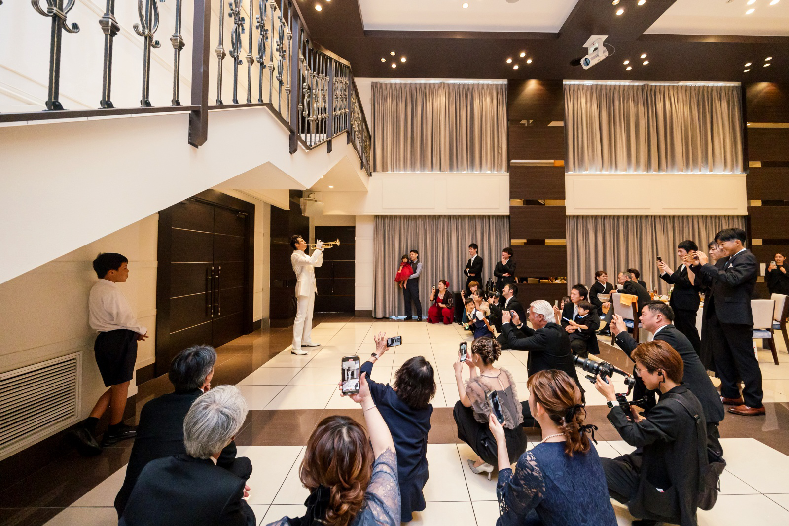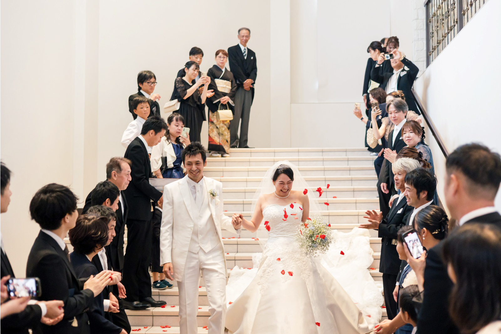 まずは2階のシンデレラ階段からのご登場。ゲストに笑顔で手を振るおふたり。パーティースタートから、楽しんでおられます。