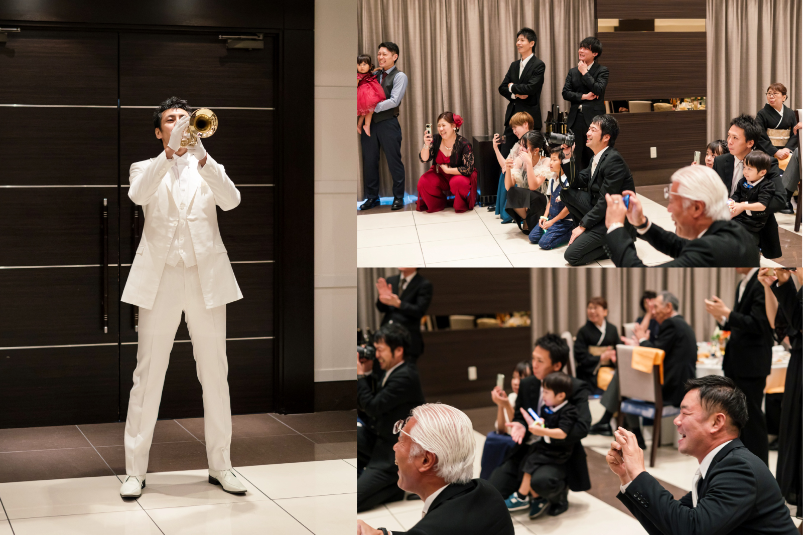 お色直し入場の合図は新郎様自らのトランペット演奏で。新郎様は大の馬好き。トランペット初心者の新郎様が半年かけてこの日の為に練習され、「ファンファーレ」を奏でられました。