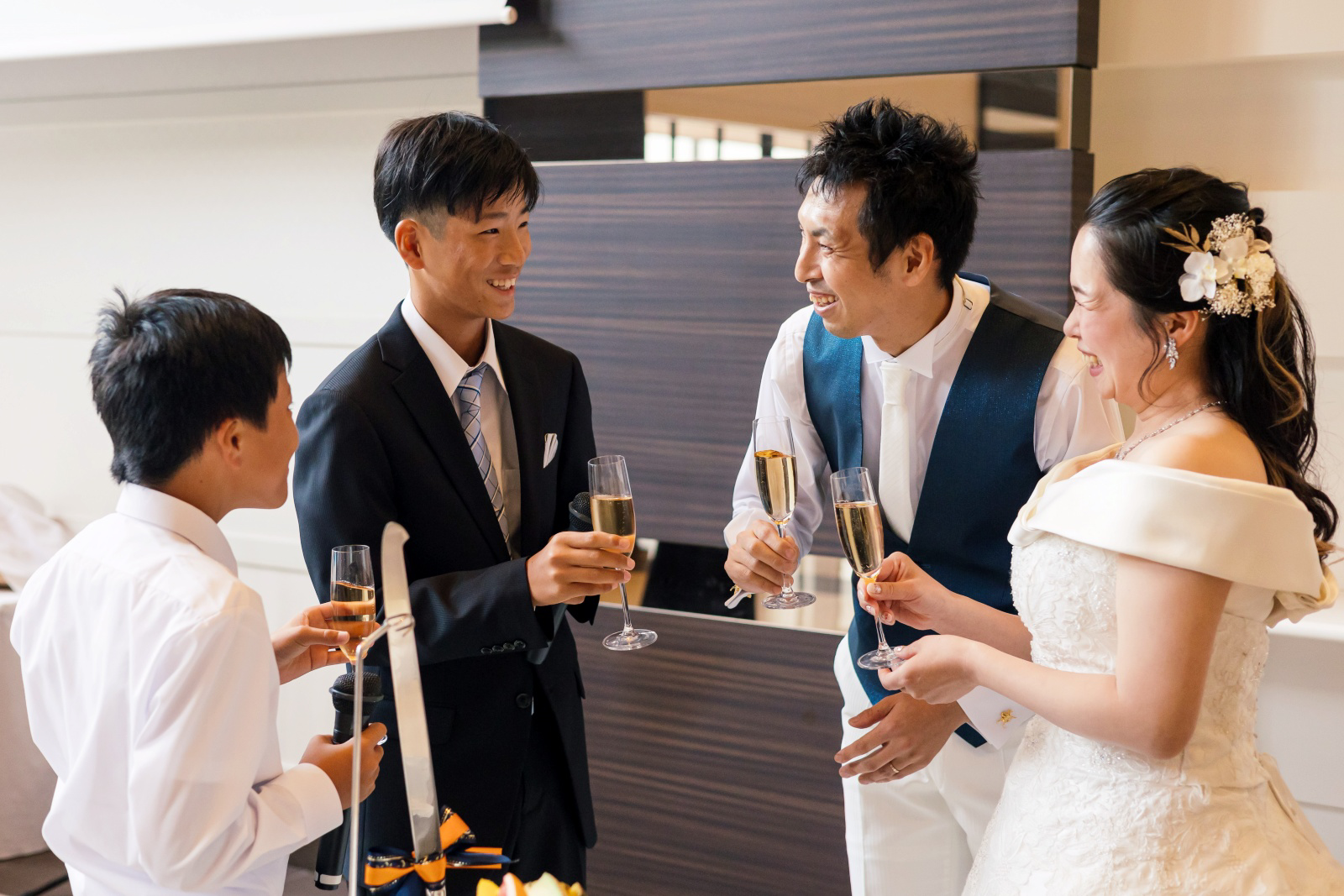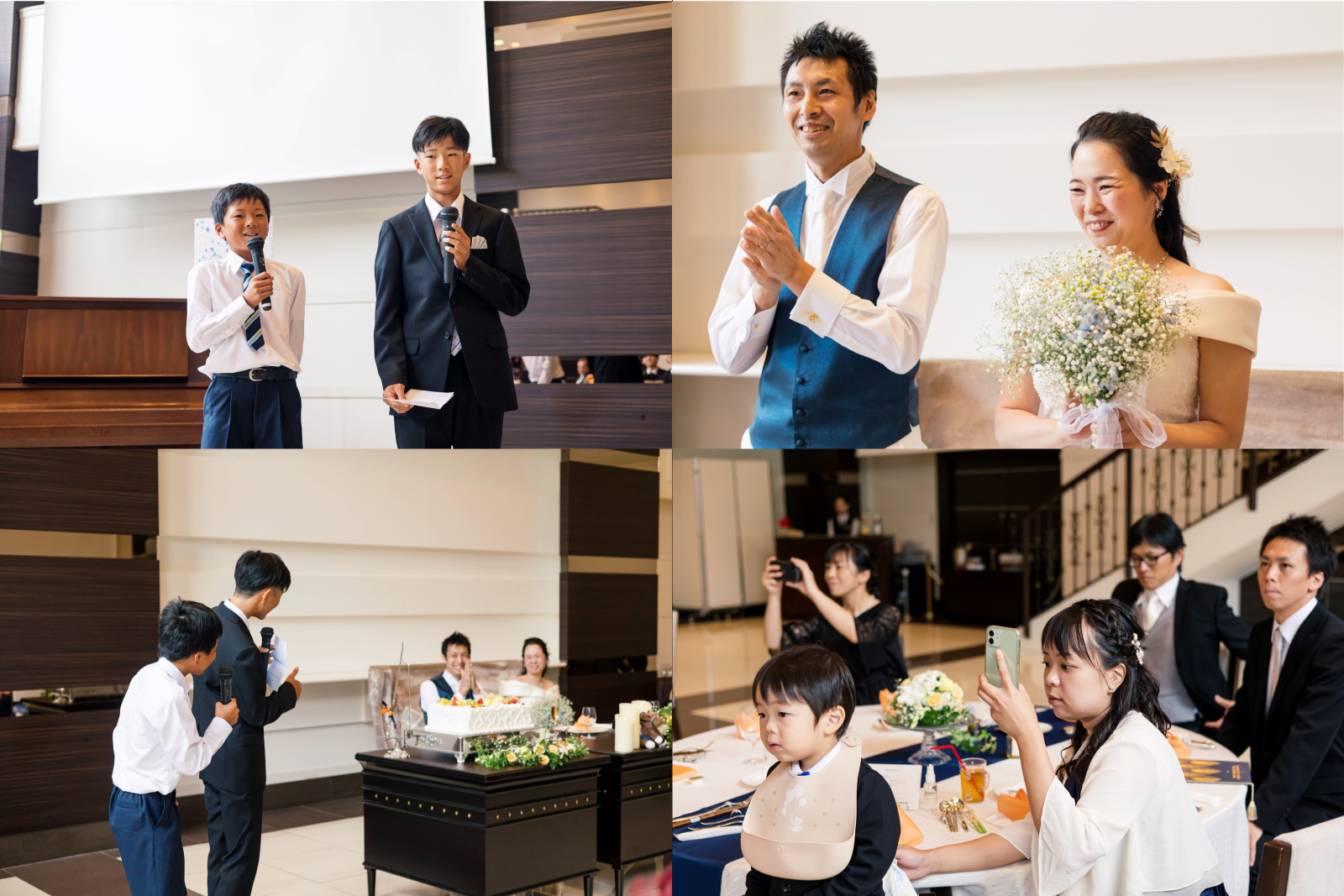 乾杯の発声は新郎様の2人の甥御様。笑顔でお祝いのメッセージを伝える様子はとても微笑ましいですね。ご家族様にとっては、緊張する場面でもあり、でも誇らしい場面でもあります。